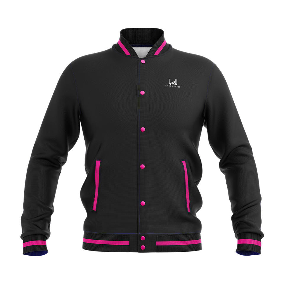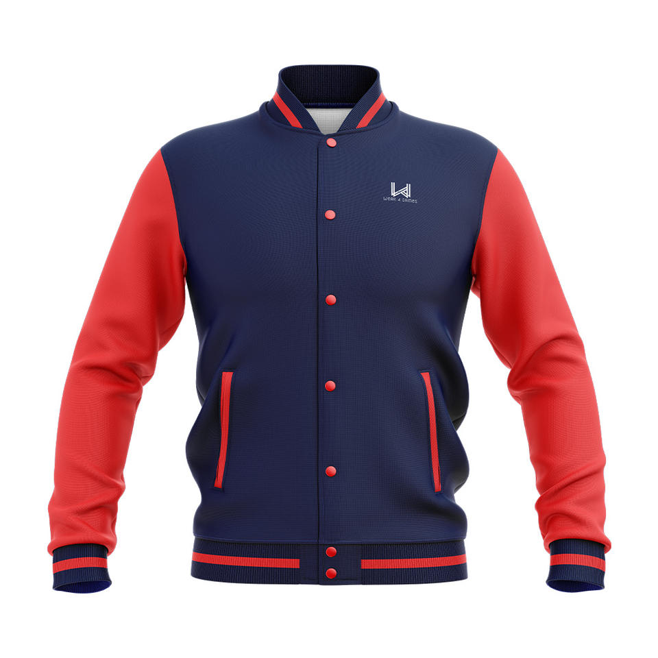 เสื้อแจ็คเก็ตเบสบอลแบบวาร์ซิตี้ แขนสีแดง ปักโลโก้ตามสั่ง คุณภาพสูง ดีไซน์แบบคัสตอม คอเสื้อแบบคอกลม