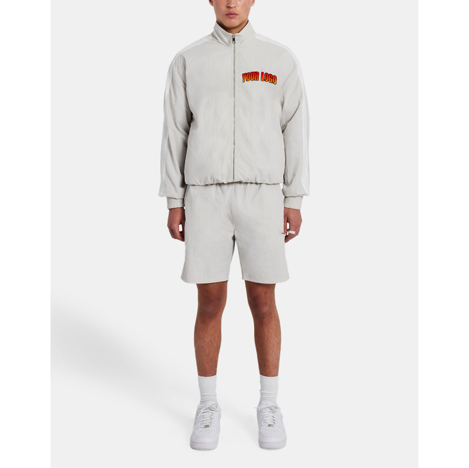 ชุดเซ็ตแจ็คเก็ตซิปสะท้อนแสงปักโลโก้แบบกำหนดเอง กางเกงขาสั้นกีฬาไนลอน ชุดวอร์ม ยูนิเซ็กส์สำหรับผู้ชาย เสื้อกันลมแบบเซ็ตขาสั้น