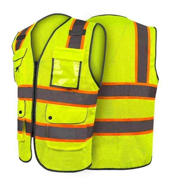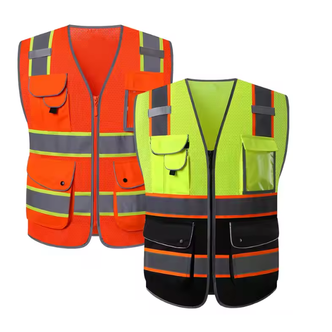 เสื้อกั๊กนิรภัยสะท้อนแสงทรงสูง2สีตัดกันสำหรับทุกเพศเสื้อกั๊กนิรภัยสำหรับผู้สำรวจความปลอดภัยโลโก้ตามสั่ง