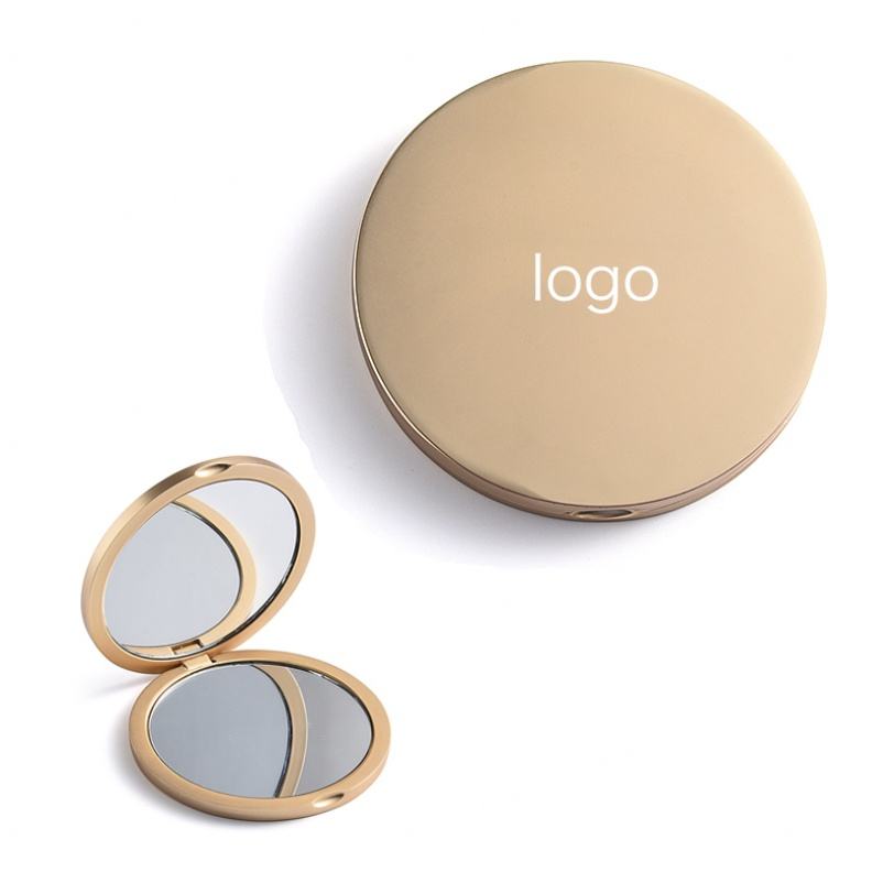 กระจกแต่งหน้าพับได้สองด้าน โลหะพิมพ์ลายซิลค์สกรีนสีทองทรงกลม พร้อมโลโก้สั่งทำ