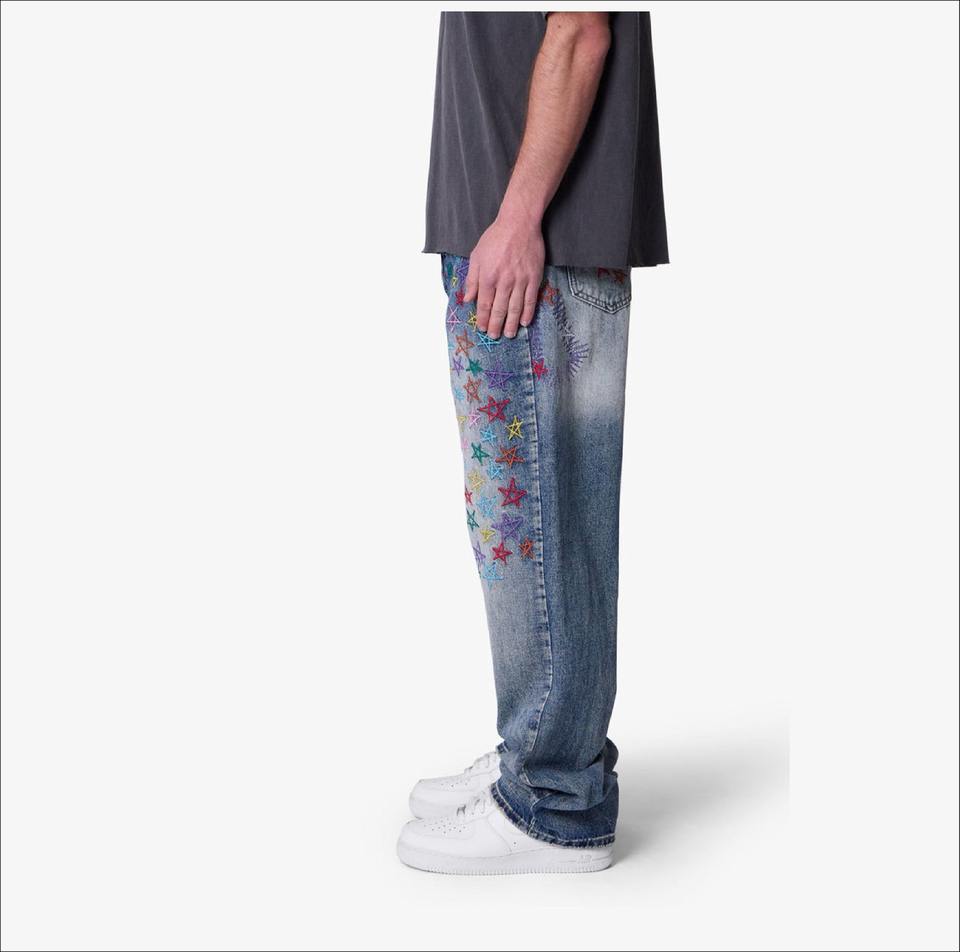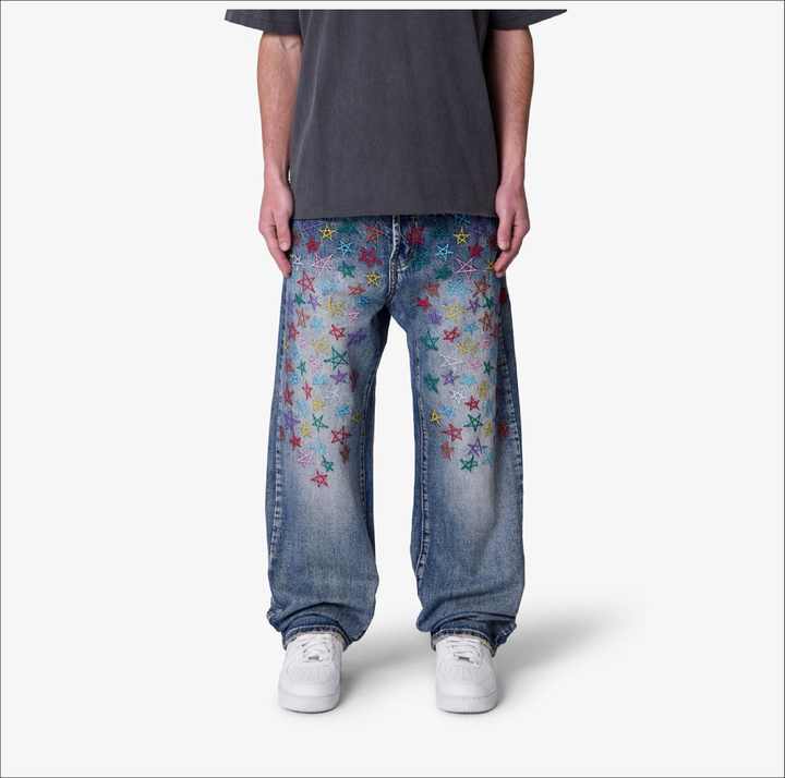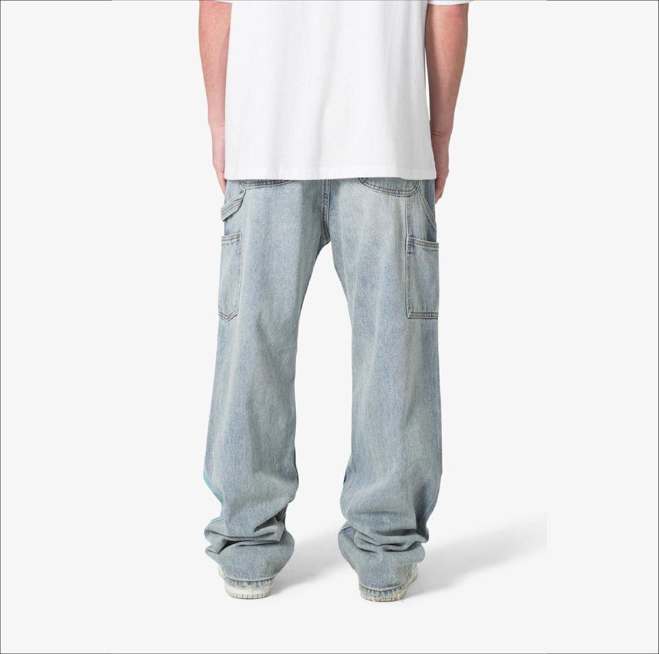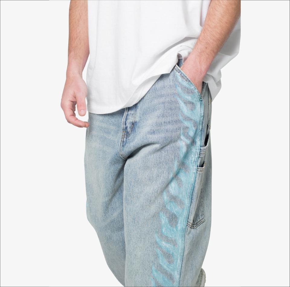 กางเกงยีนส์ขาบานสำหรับผู้ชายทรงหลวมเอวสูงล้างได้พิมพ์ลายหน้าจอโลโก้แบบออกแบบได้ตามต้องการ