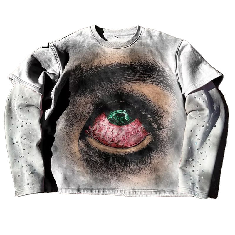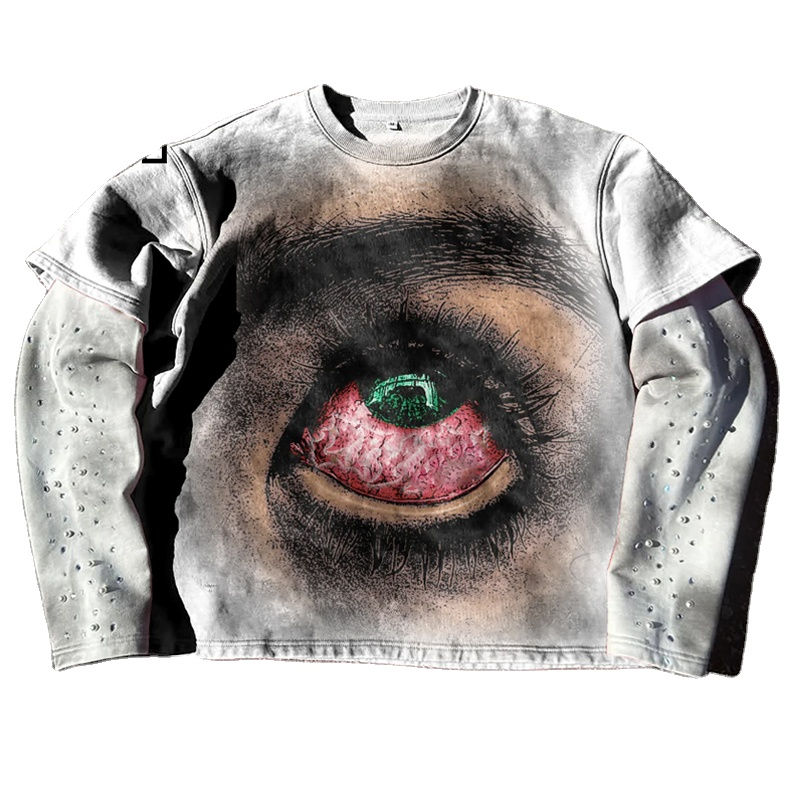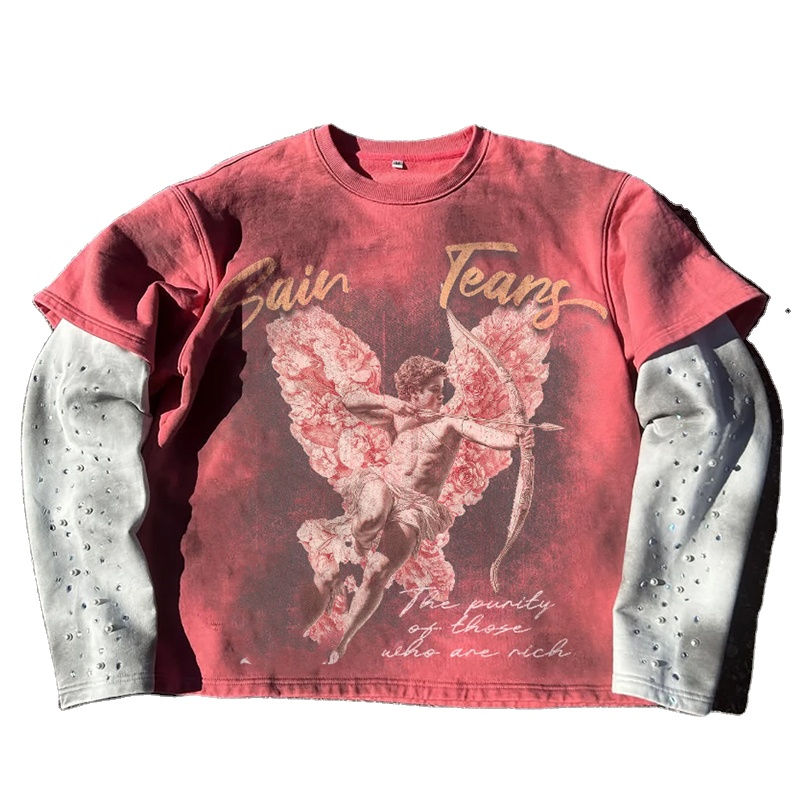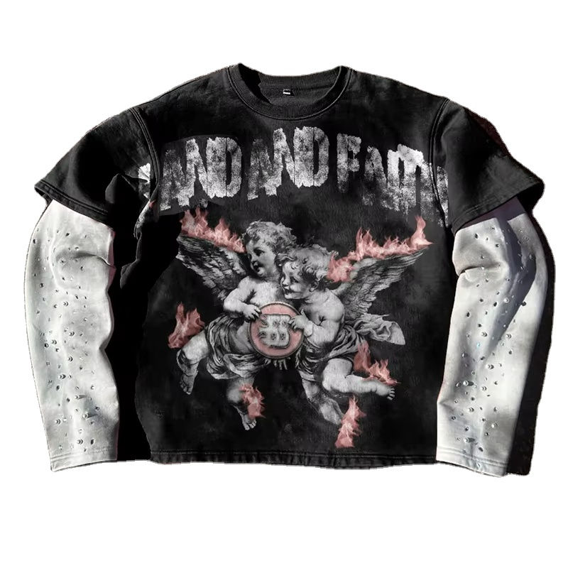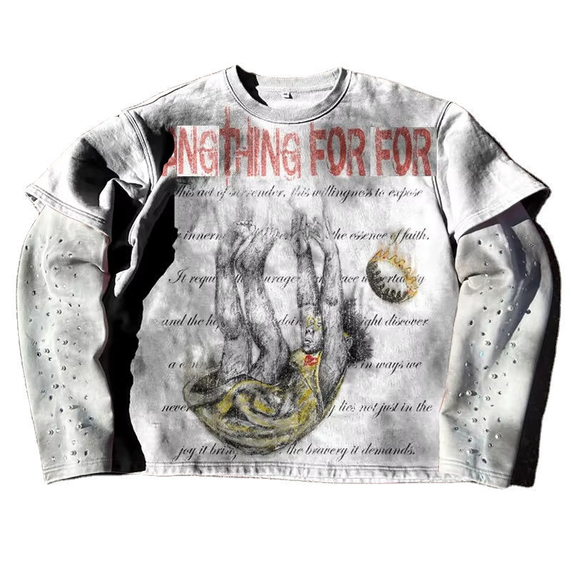 เสื้อยืดคอตตอนแขนยาวสองชั้นปักลายกราฟิกพิมพ์โลโก้ตามสั่ง สไตล์วินเทจ ลุคทำเก่า ซักนุ่ม สำหรับผู้ชาย ประดับด้วยคริสตัล