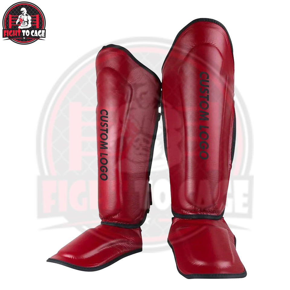 สนับแข้งหนังแท้แบบเต็มขา ป้องกันหน้าแข้งและหลังเท้า สำหรับ MMA มวยไทย ฝึกซ้อม พร้อมสายรัดแบบตะขอเกี่ยว ดูดซับแรงกระแทก รับทำโลโก้ตามสั่ง