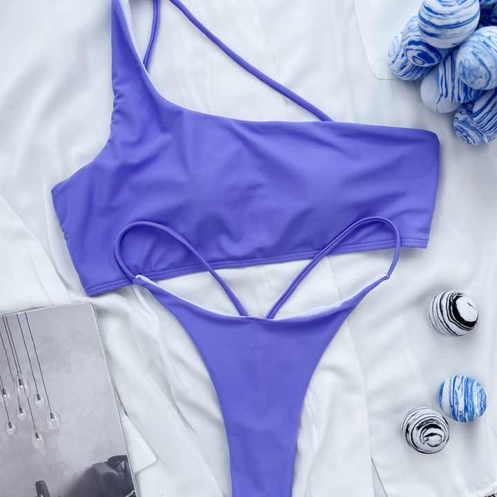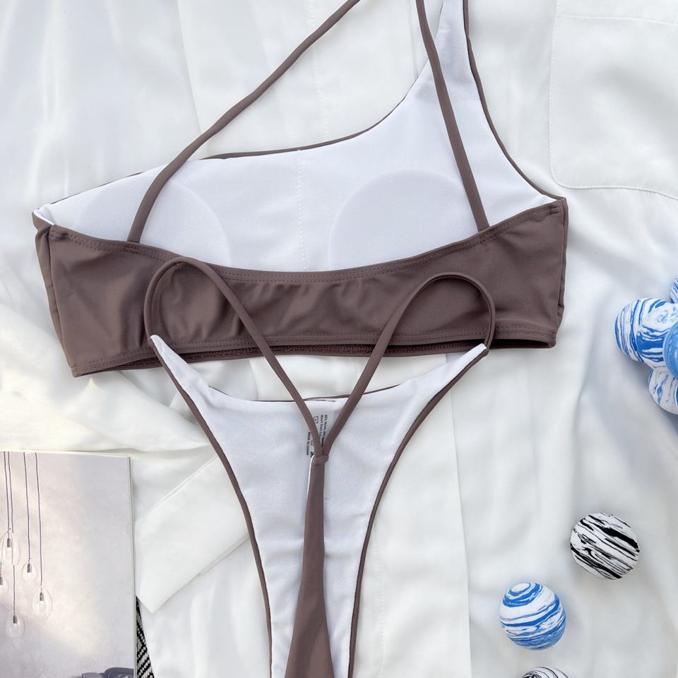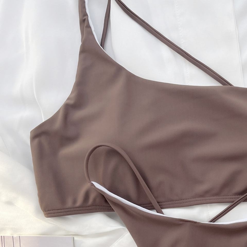 ชุดว่ายน้ำวันพีซแบบผูกหลัง ไหล่เดียว คุณภาพสูง ลายโลโก้ตามสั่ง ทรงเซ็กซี่ บิกินี่แบบผูกเชือก ชุดว่ายน้ำเว้าสูง ชุดว่ายน้ำสีพื้น