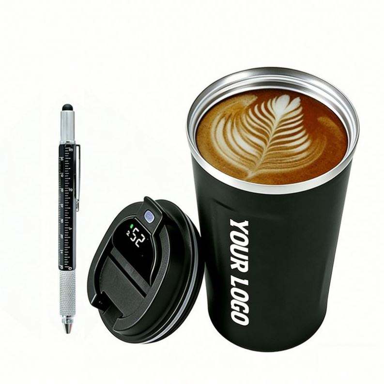 แก้วกาแฟสุญญากาศสแตนเลสแบบพกพาสำหรับสำนักงานและเดินทาง พร้อมฝาปิด แสดงอุณหภูมิได้ โลโก้สั่งทำได้ เหมาะเป็นของขวัญส่งเสริมการขายสำหรับธุรกิจ