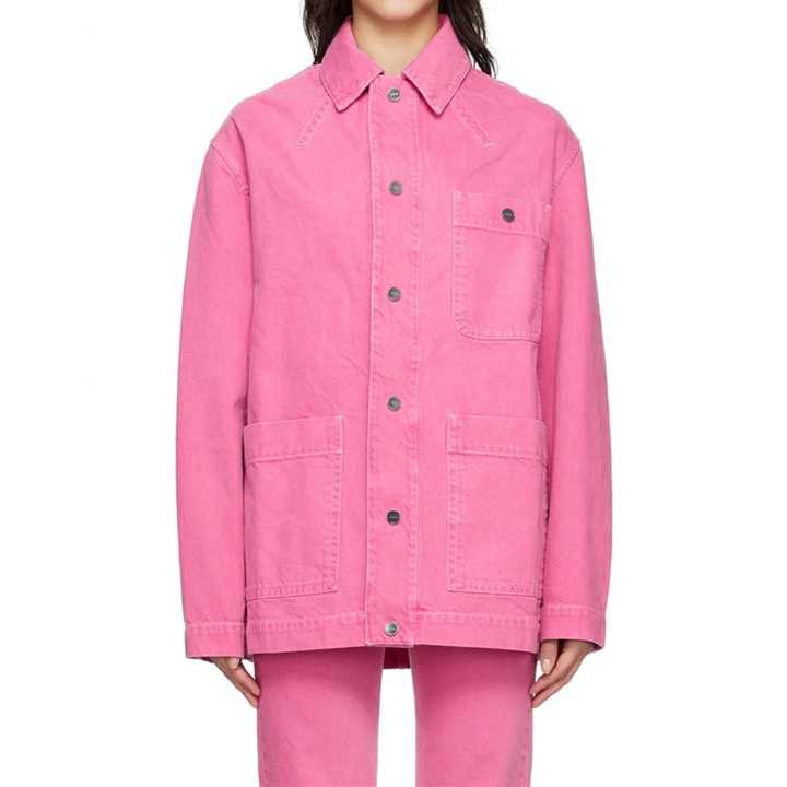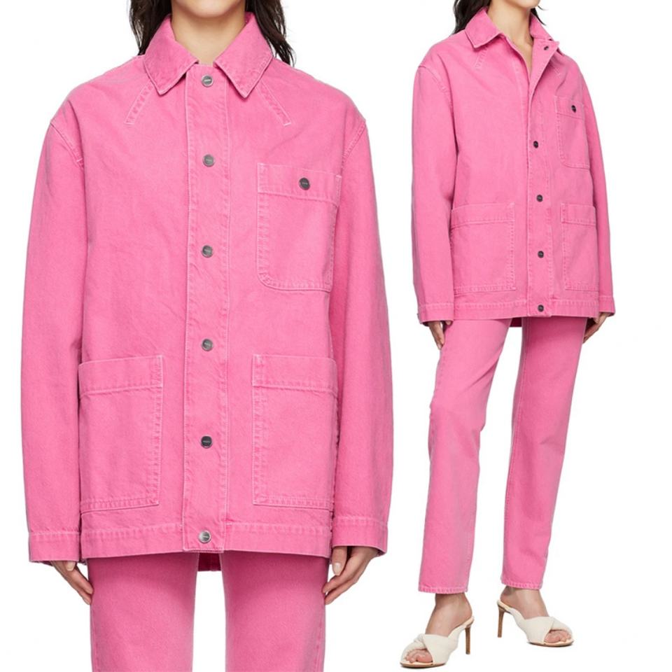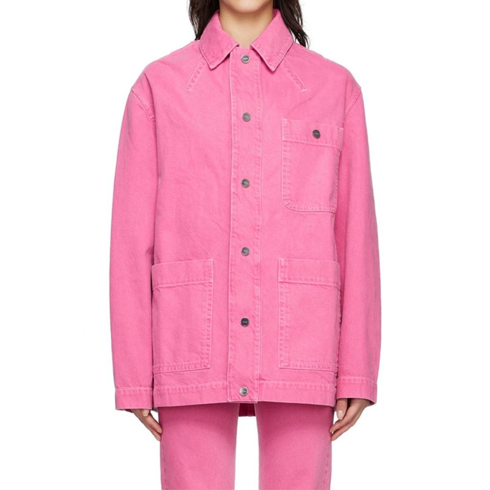 แจ็คเก็ตยีนส์โอเวอร์ไซส์สำหรับผู้หญิง สีชมพู ผ้าฝ้ายเดนิม แต่งกระดุมแป๊กติดโลโก้แบบกำหนดเอง มีกระเป๋าปะขนาดใหญ่