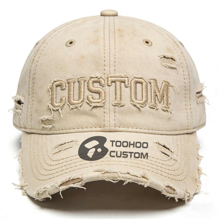 หมวกแก๊ปทรงวินเทจผ้าฝ้ายกันน้ำพิมพ์ลายโลโก้แบบกำหนดเอง สไตล์สปอร์ต ขาดๆ แบบดิสเทรส สำหรับทุกเพศ สตรีทแวร์