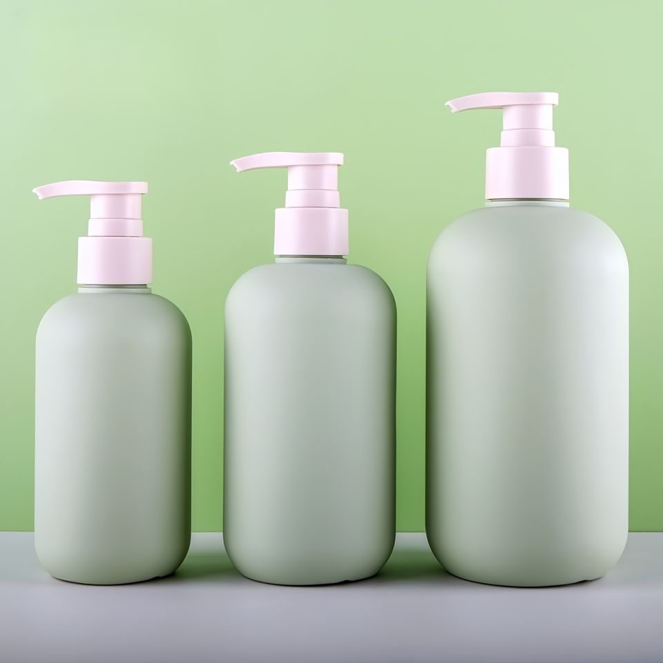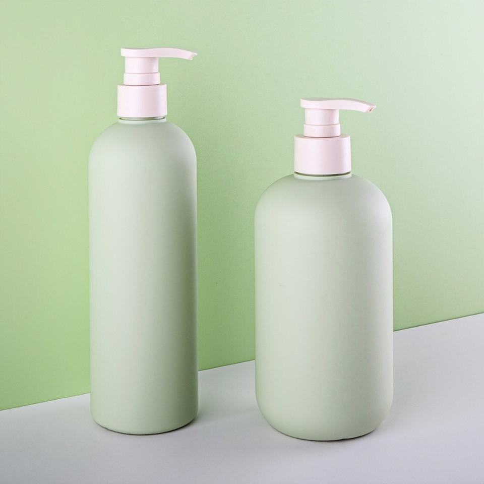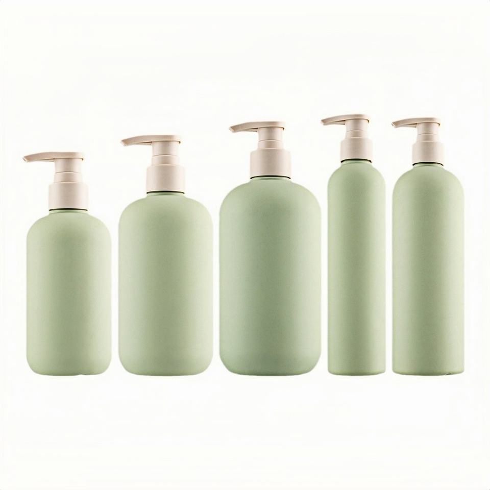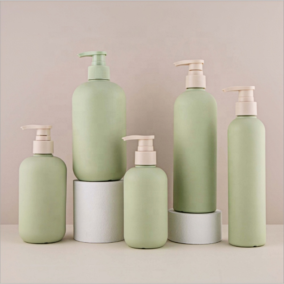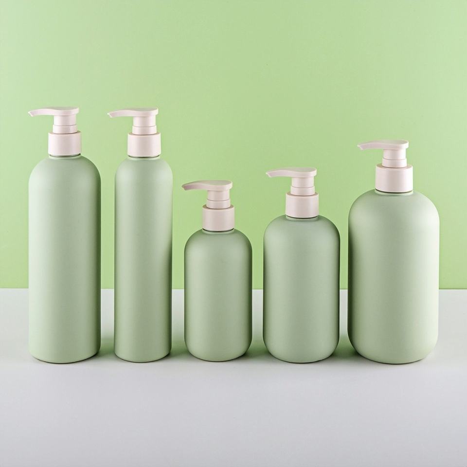 ขวดแชมพูพลาสติก HDPE สีเขียวด้านแบบสัมผัสนุ่ม พิมพ์โลโก้ได้ ขนาด 200 มล. 300 มล. 500 มล. สำหรับบรรจุภัณฑ์โลชั่นและเครื่องสำอางแบบปั๊ม