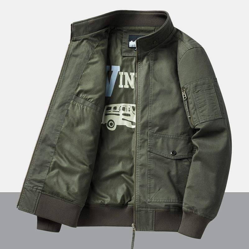 เสื้อแจ็คเก็ตผู้ชายสไตล์ลำลองสำหรับทำงาน คอตั้ง ผ้าฝ้าย 100% ใส่ได้ทั้งฤดูใบไม้ผลิและฤดูใบไม้ร่วง มีกระเป๋าหลายช่อง ทรงหลวม พร้อมปักโลโก้ตามสั่ง
