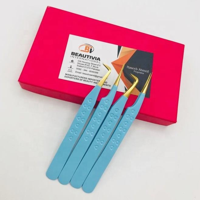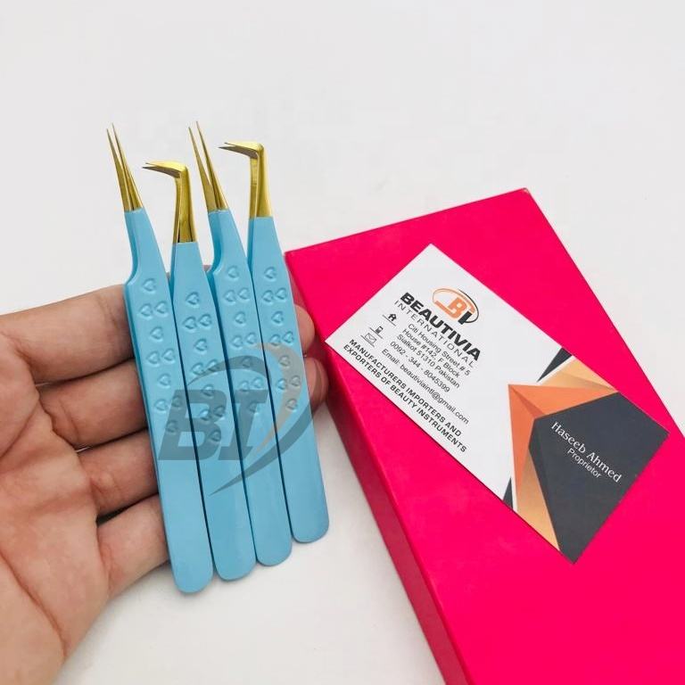 ปลายแหลมพิมพ์ลายหัวใจสีฟ้าสำหรับต่อขนตาแหนบต่อขนตาทำจากสเตนเลสออกแบบโลโก้ได้ตามต้องการ