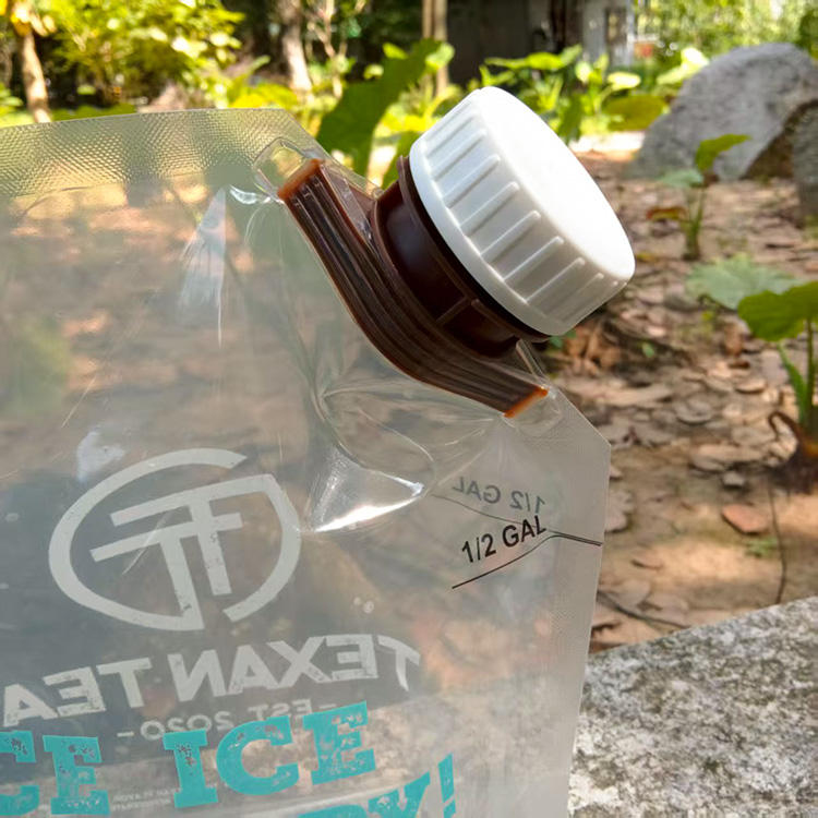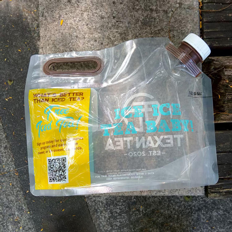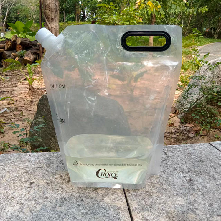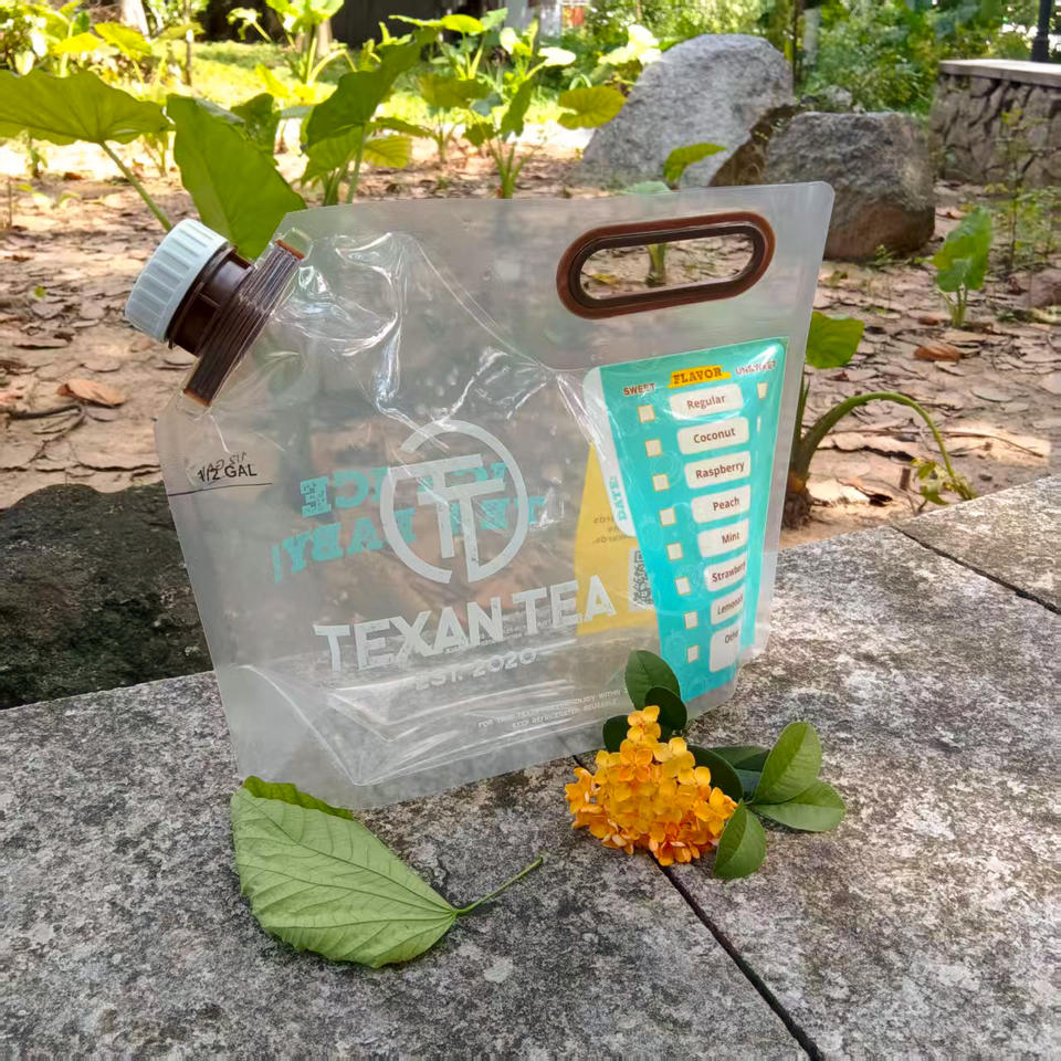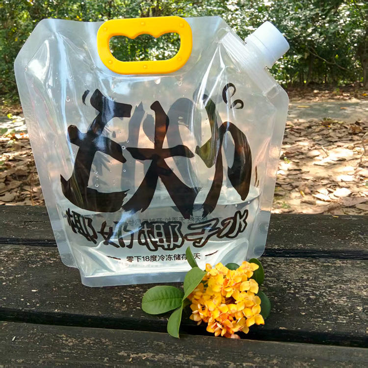 ถุงพลาสติก PE แบบตั้งได้ พิมพ์โลโก้ได้ รีไซเคิลได้ มีจุกมุม ปิดผนึกด้วยความร้อน สำหรับน้ำแร่ น้ำผลไม้ เครื่องดื่มชนิดน้ำ