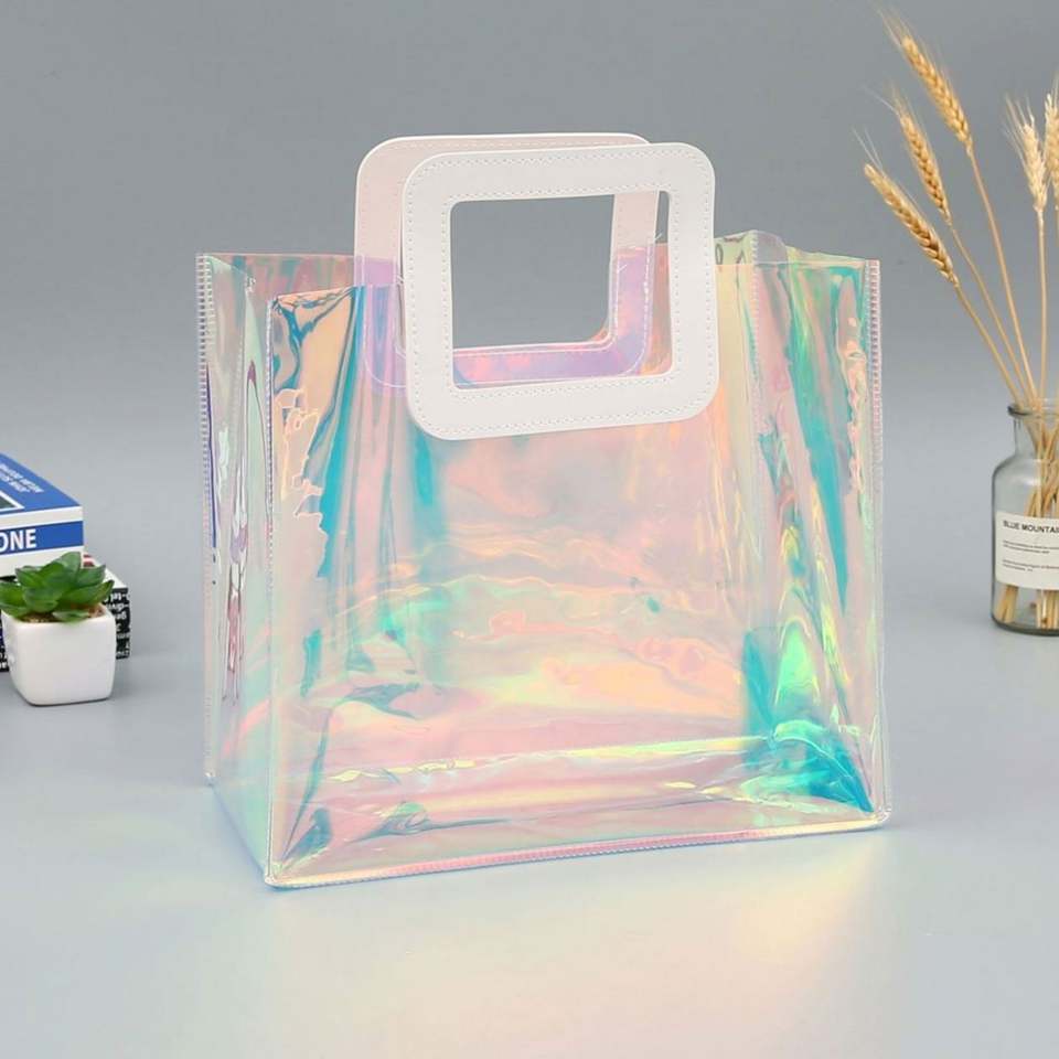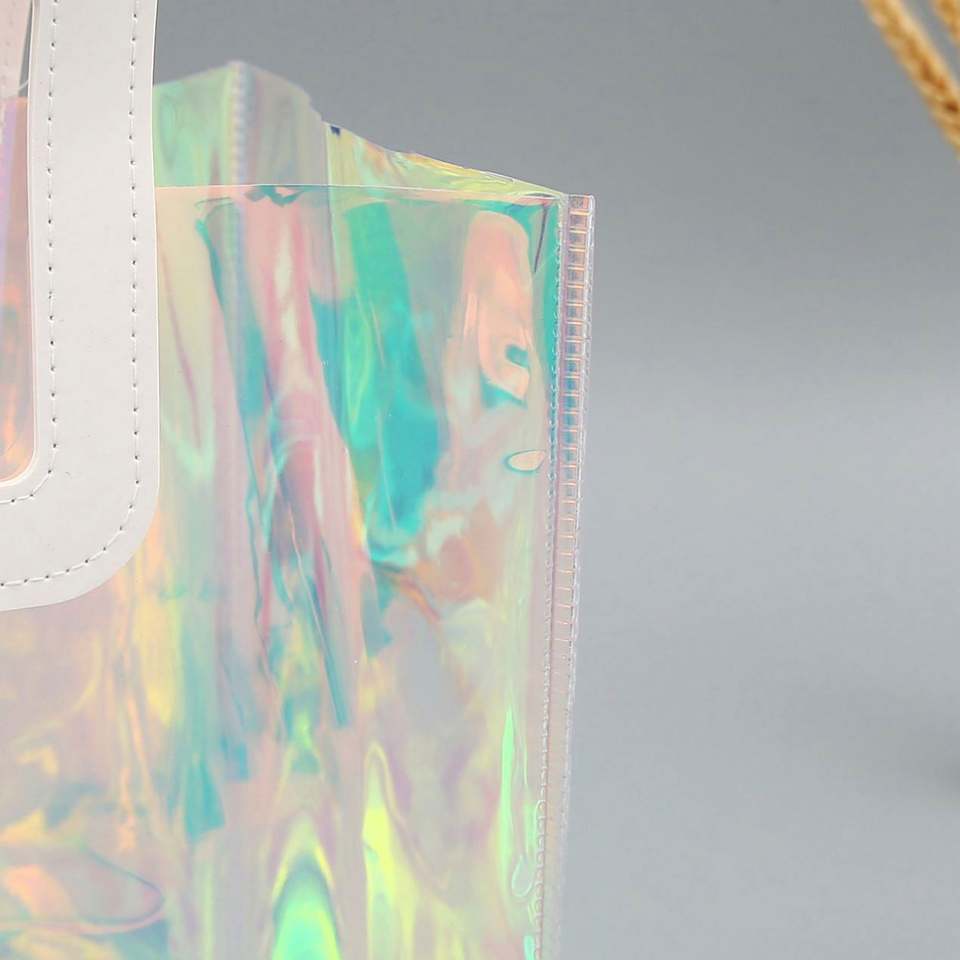 กระเป๋าโท้ทพีวีซีสีรุ้งเก๋ไก๋พร้อมโลโก้แบบกำหนดเอง กระเป๋าใส่ของแบบใส กระเป๋าช้อปปิ้งโฮโลแกรมใส