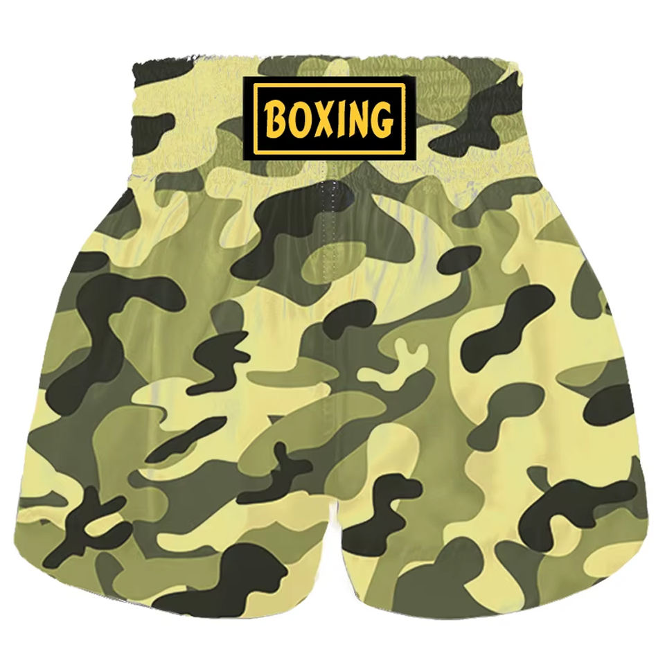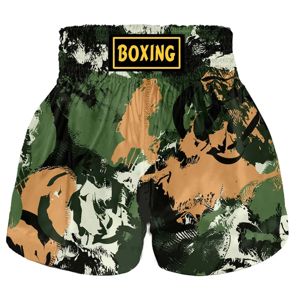 กางเกงมวยไทยขาสั้นผ้าไนลอนโพลีเอสเตอร์พิมพ์ลายพรางสำหรับผู้ชายกางเกงศิลปะการต่อสู้ทำจากโพลีเอสเตอร์100% กำหนดโลโก้ได้เอง
