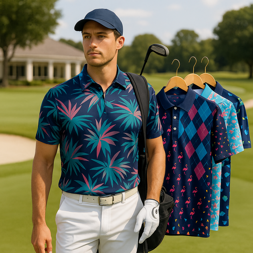 เสื้อโปโลเล่นกอล์ฟของผู้ชายเสื้อกีฬาแขนสั้นพิมพ์ลายพิมพ์ซับลิเมชันโลโก้ตามสั่ง