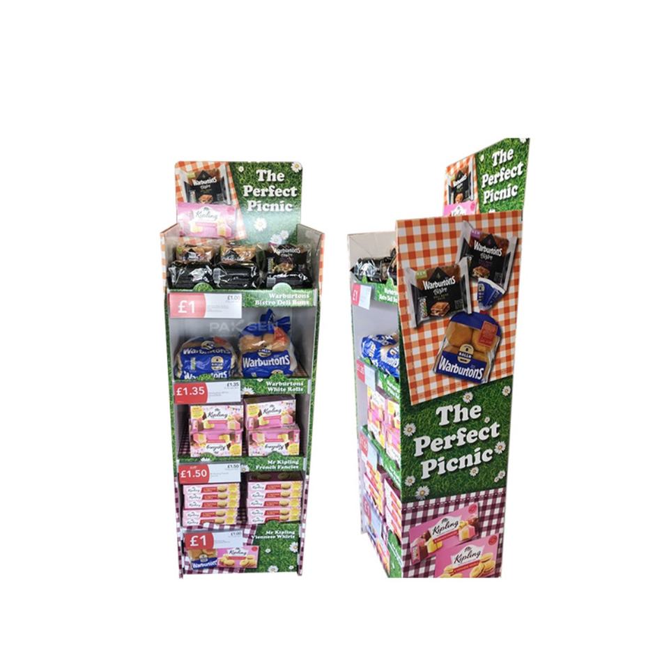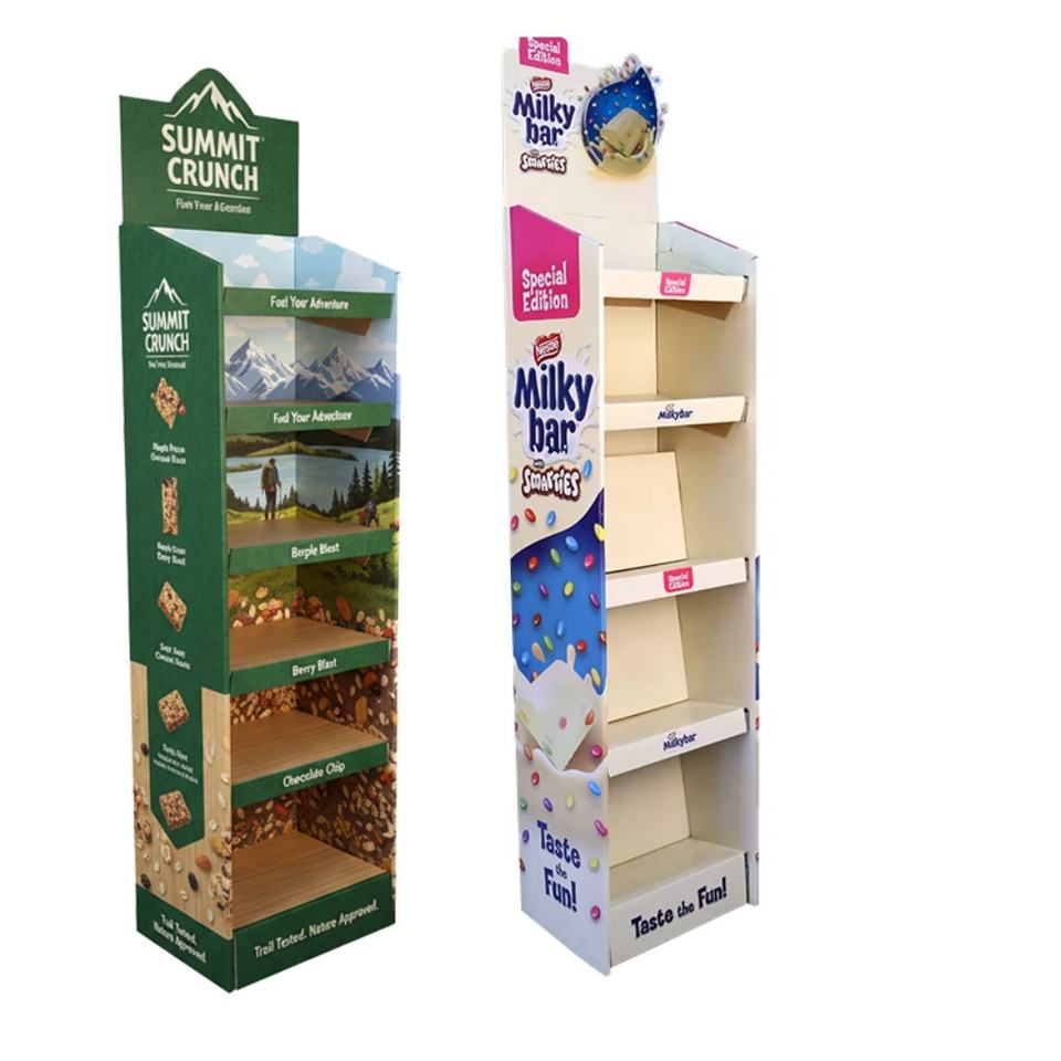 ชั้นวางสินค้าแบบพับได้สำหรับซุปเปอร์มาร์เก็ตพร้อมโลโก้สั่งทำ ชั้นวางแสดงสินค้าขนมขบเคี้ยวแบบตั้งพื้นทำจากกระดาษแข็ง ชั้นวางแสดงสินค้าอาหารสำหรับขายปลีก