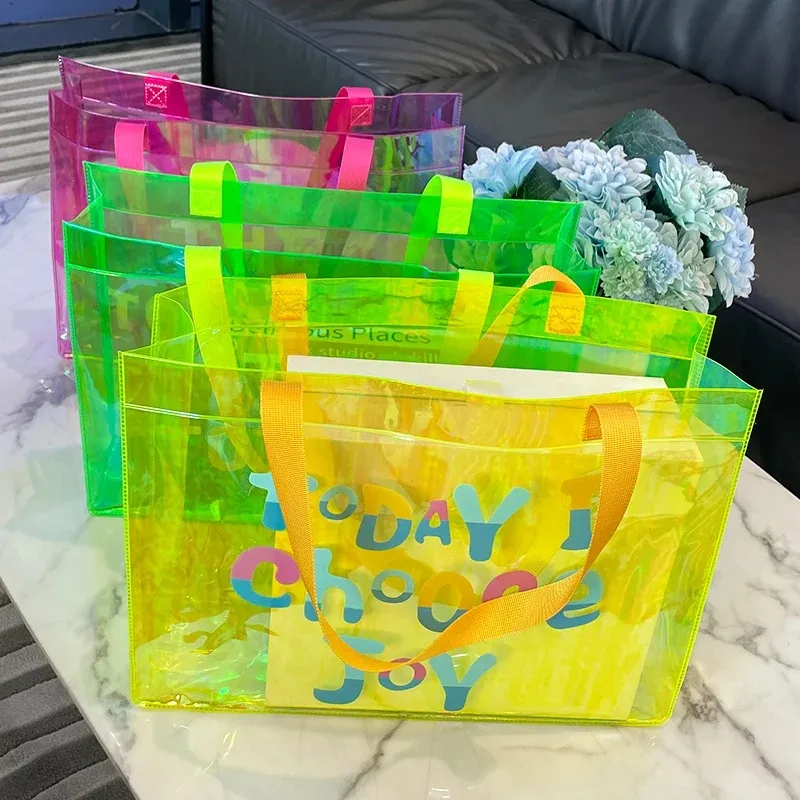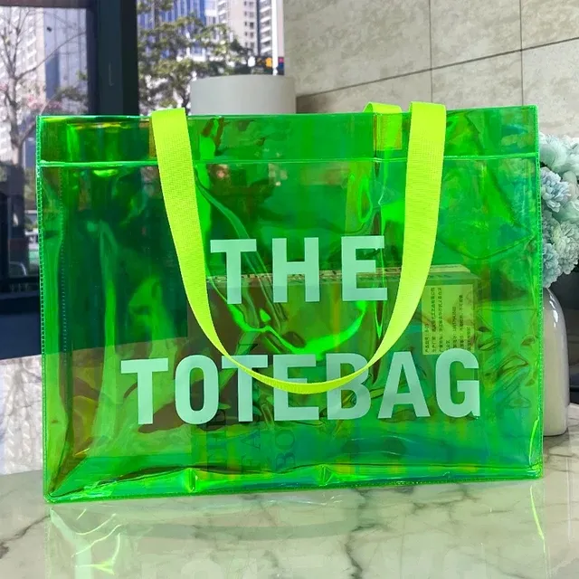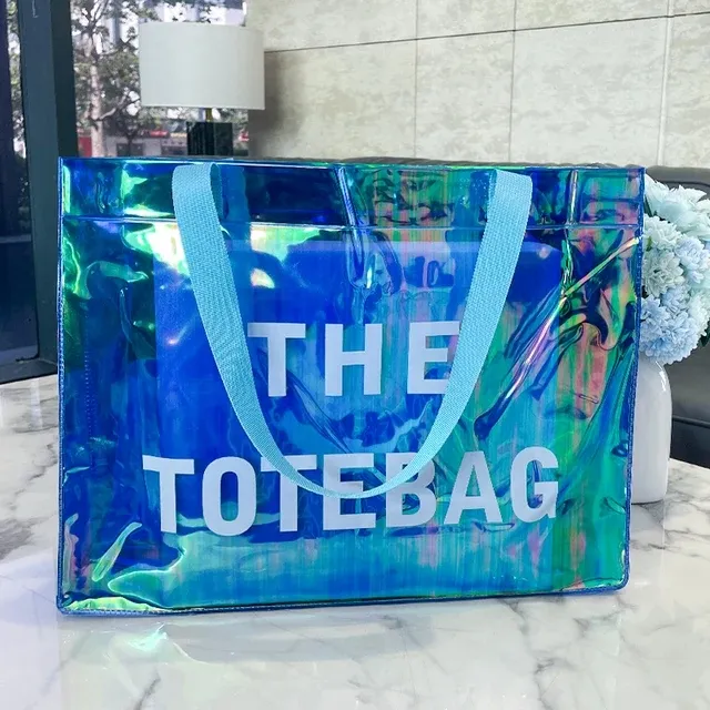 กระเป๋าช้อปปิ้งพีวีซีหนาพิมพ์ลายโฮโลแกรมเลเซอร์สีรุ้ง พร้อมหูหิ้ว PU และสายสะพายไหล่ ดีไซน์ทันสมัย ผลิตในจีน รับทำโลโก้ตามสั่ง