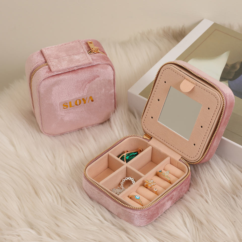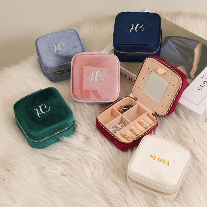 กล่องใส่เครื่องประดับแบบพกพา สี่เหลี่ยม พร้อมซิป กำมะหยี่ มีกระจก สำหรับใส่ของชำร่วยงานแต่งงาน รับทำโลโก้ตามสั่ง