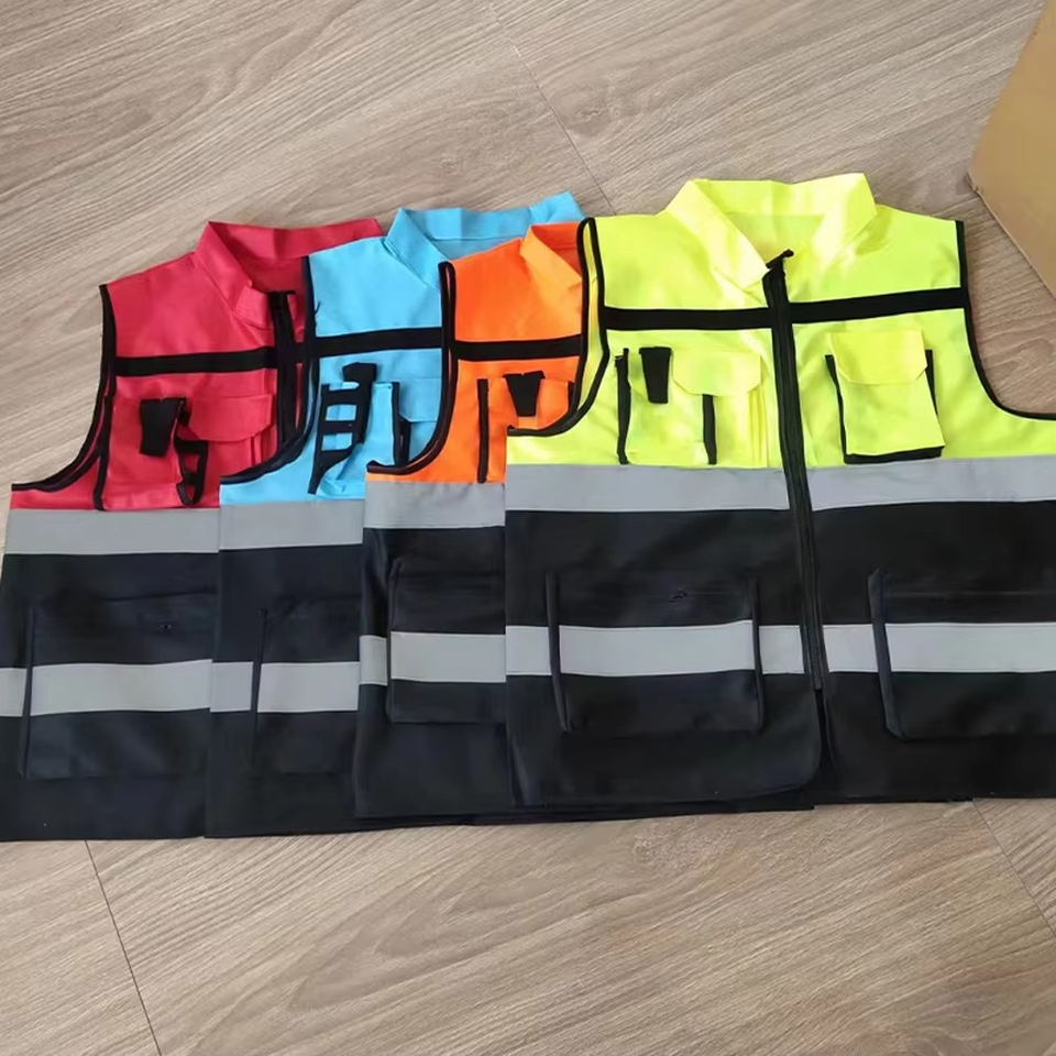 เสื้อกั๊กนิรภัยทูโทนสีสะท้อนแสงโลโก้แบบกำหนดเองสำหรับงานก่อสร้างขนาดใหญ่พิเศษมีกระเป๋าและซิป