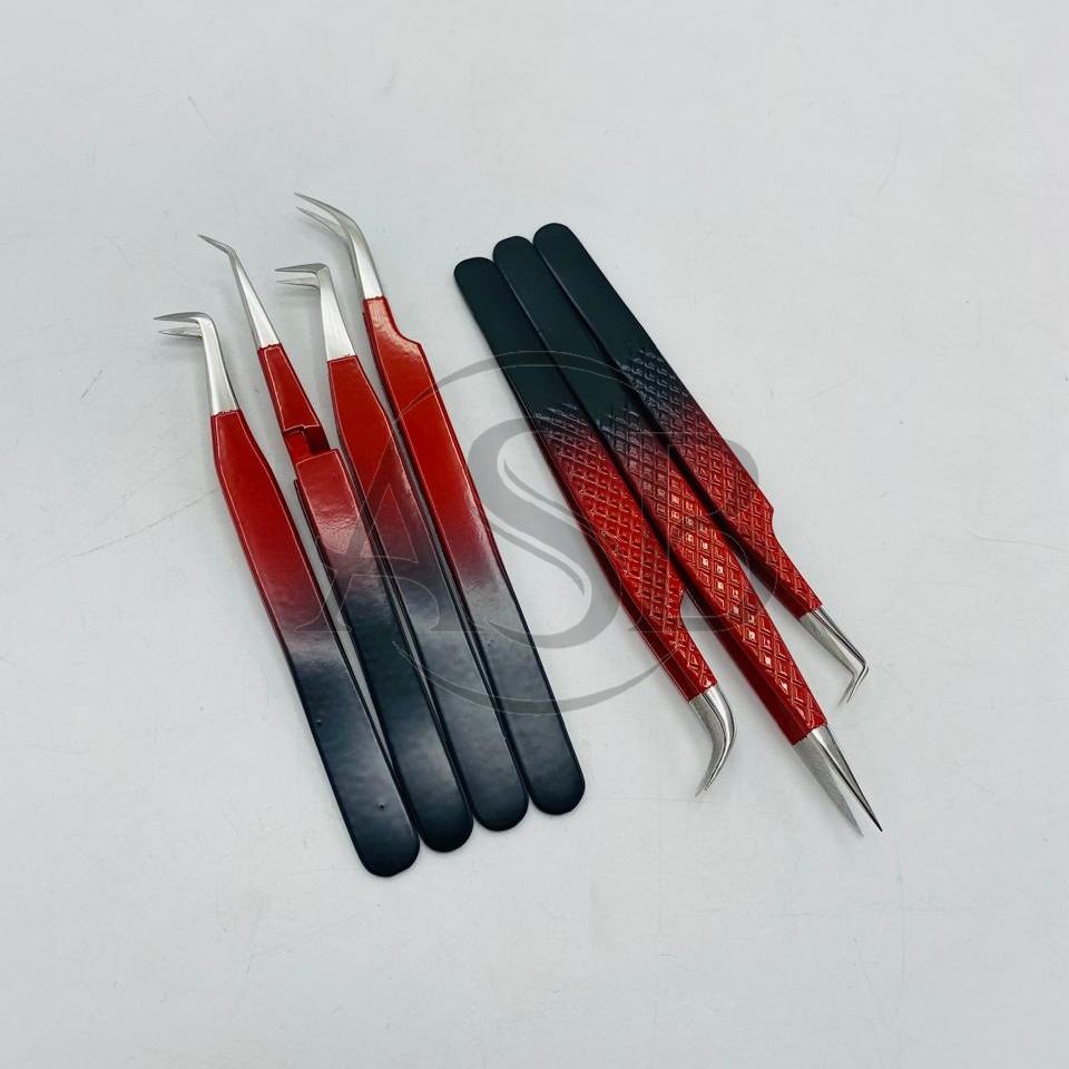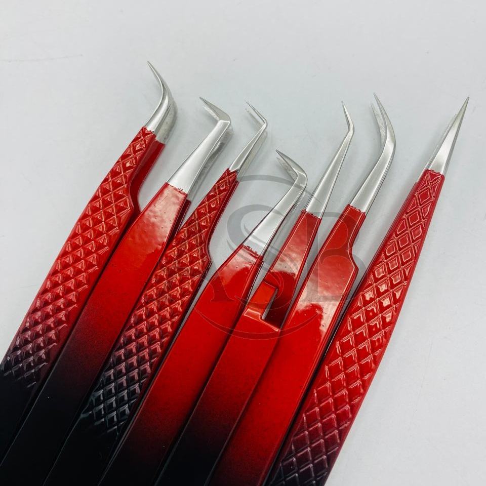แหนบปลายแหลมสำหรับต่อขนตาแบบสองสีออมเบรสีแดงสีดำทำจากสเตนเลสทนทานแข็งแรงปรับแต่งโลโก้ได้ตามต้องการ