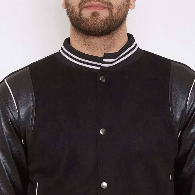 แจ็กเก็ตทีมเบสบอลคู่วิทยาลัยแขนเสื้อหนังปักลายตัวอักษรสีดำ
