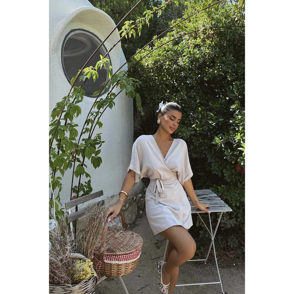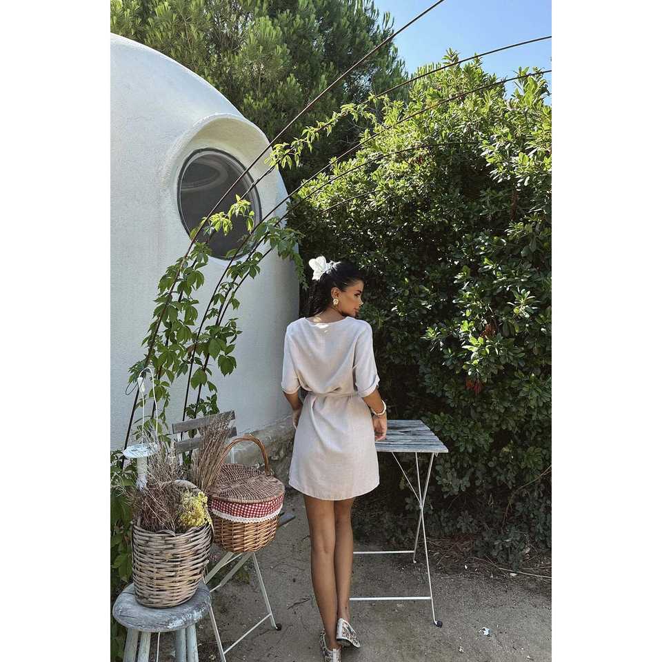 เดรสสั้นผูกเอวสไตล์วินเทจลายโลโก้แบบกำหนดเอง ผ้าสแปนเด็กซ์ ไซส์ XL เอวยางยืด มีซับใน เหมาะสำหรับฤดูใบไม้ผลิหรือฤดูใบไม้ร่วง