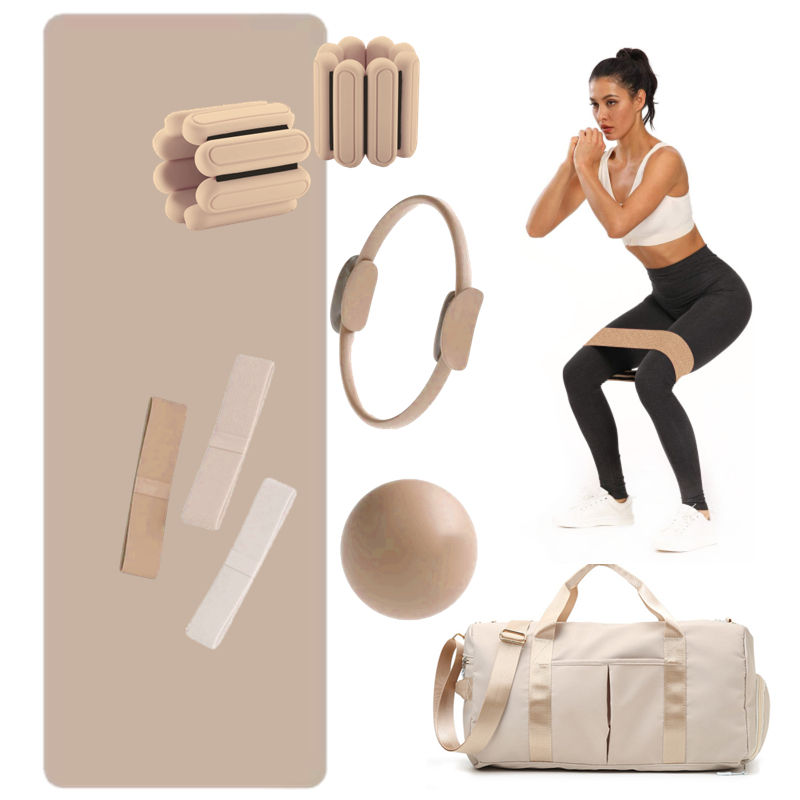 โลโก้สั่งทำ ขายส่ง โยคะสำหรับผู้หญิง ผ้าสีชมพูยืดหยุ่น แถบต้านทานพร้อมวงแหวนพิลาทิส ชุดอุปกรณ์พิลาทิส
