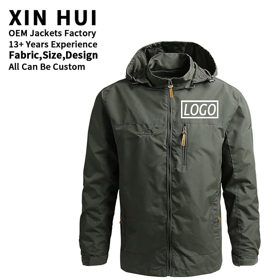 เสื้อแจ็คเก็ตกันลมกันน้ำสำหรับผู้ชายแบบมีฮู้ดสำหรับฤดูหนาว พิมพ์โลโก้ได้ตามต้องการ ผลิตโดยโรงงาน OEM น้ำหนักเบา เหมาะสำหรับการเดินป่า
