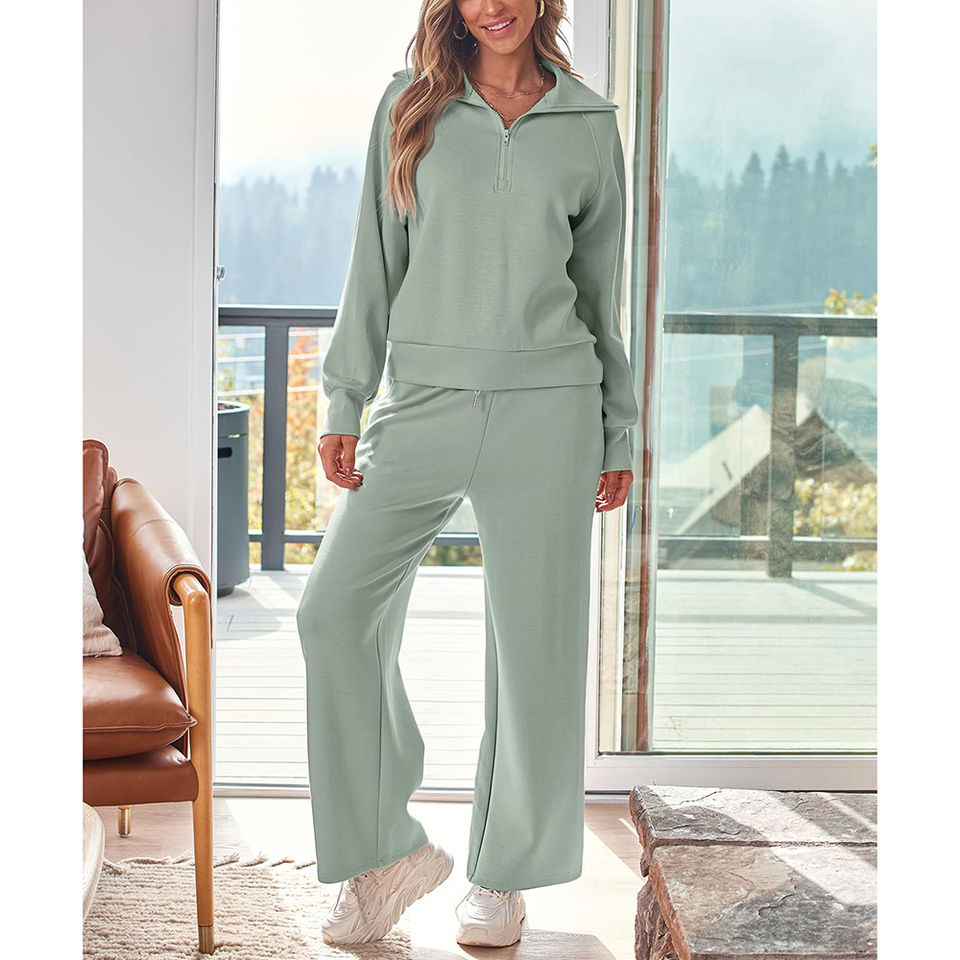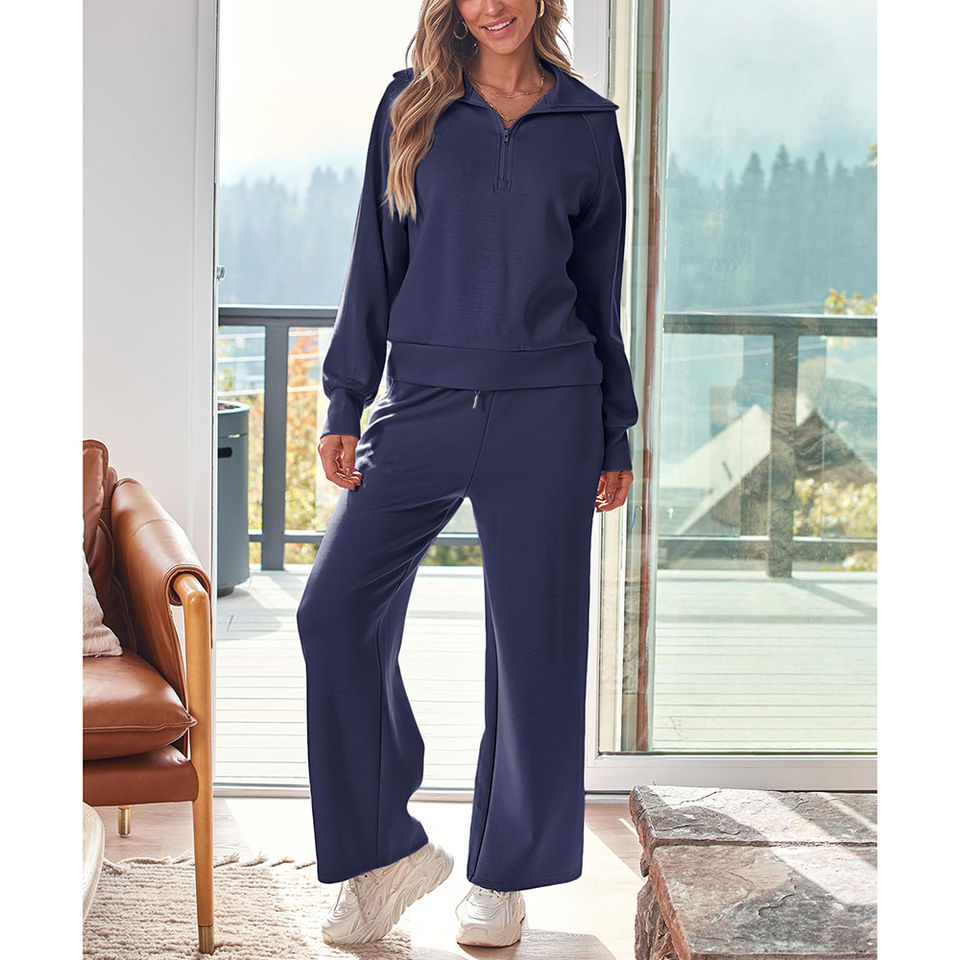 ชุดเซ็ตเสื้อฮู้ดครึ่งซิปและกางเกงขายาวทรงกว้าง 2 ชิ้น พร้อมโลโก้แบบกำหนดเองสำหรับผู้หญิง ชุดออกกำลังกาย ชุดวอร์ม