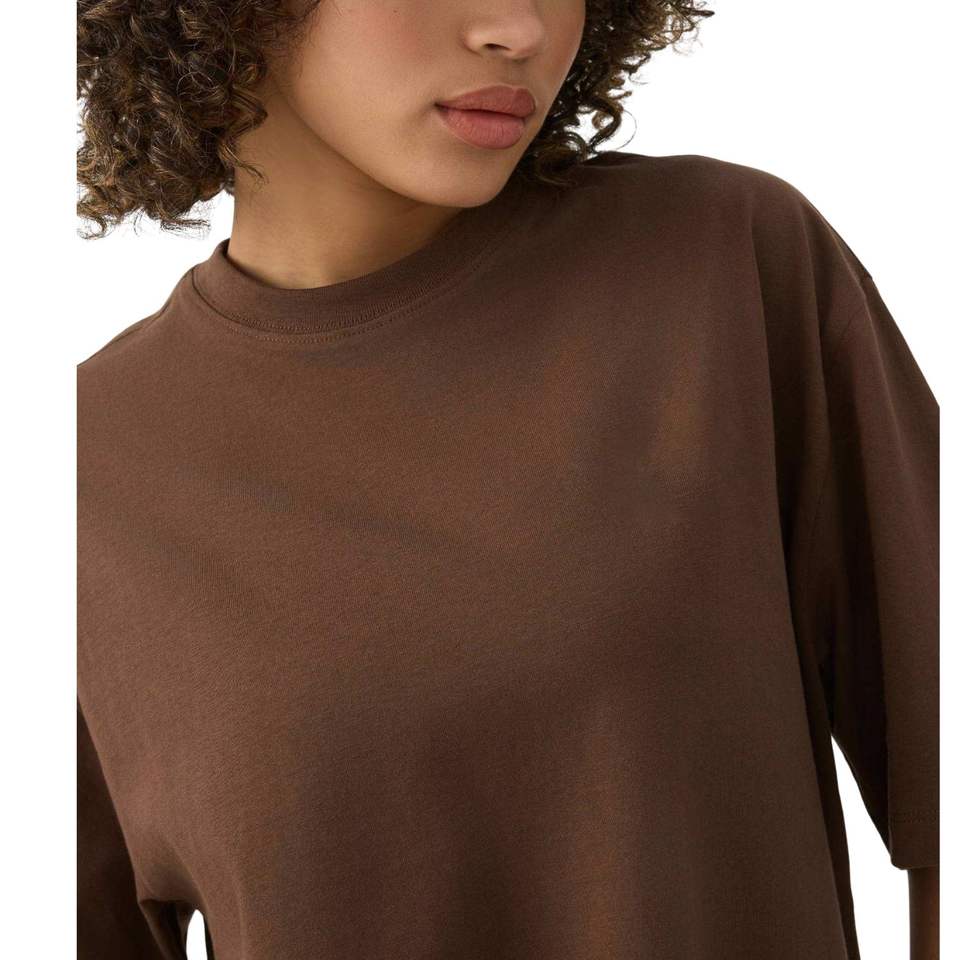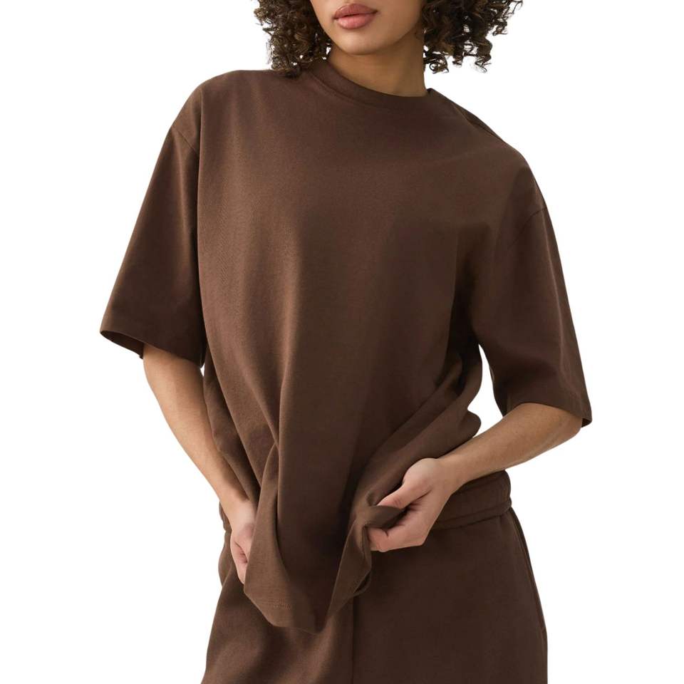 เสื้อยืดโอเวอร์ไซส์สีน้ำตาลสำหรับผู้หญิง พิมพ์โลโก้ได้ตามต้องการ ทรงหลวม ไหล่ตก ผ้าฝ้าย สตรีทแวร์ เสื้อเปล่า ทรงหลวม สวมใส่สบาย ขายส่ง รับผลิตแบบ OEM