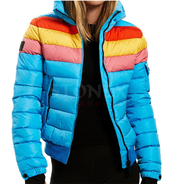 แจ็กเก็ตขนเป็ดสำหรับผู้หญิงเสื้อโค้ทขนเป็ดสีขาวผ้าสแปนเด็กซ์บุผ้าฝ้ายเสื้อแจ็กเก็ตแบบถักสำหรับใส่โลโก้ได้ตามต้องการ