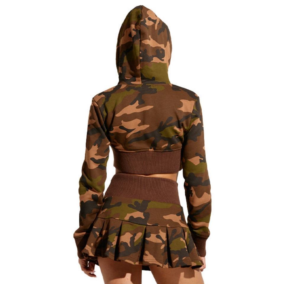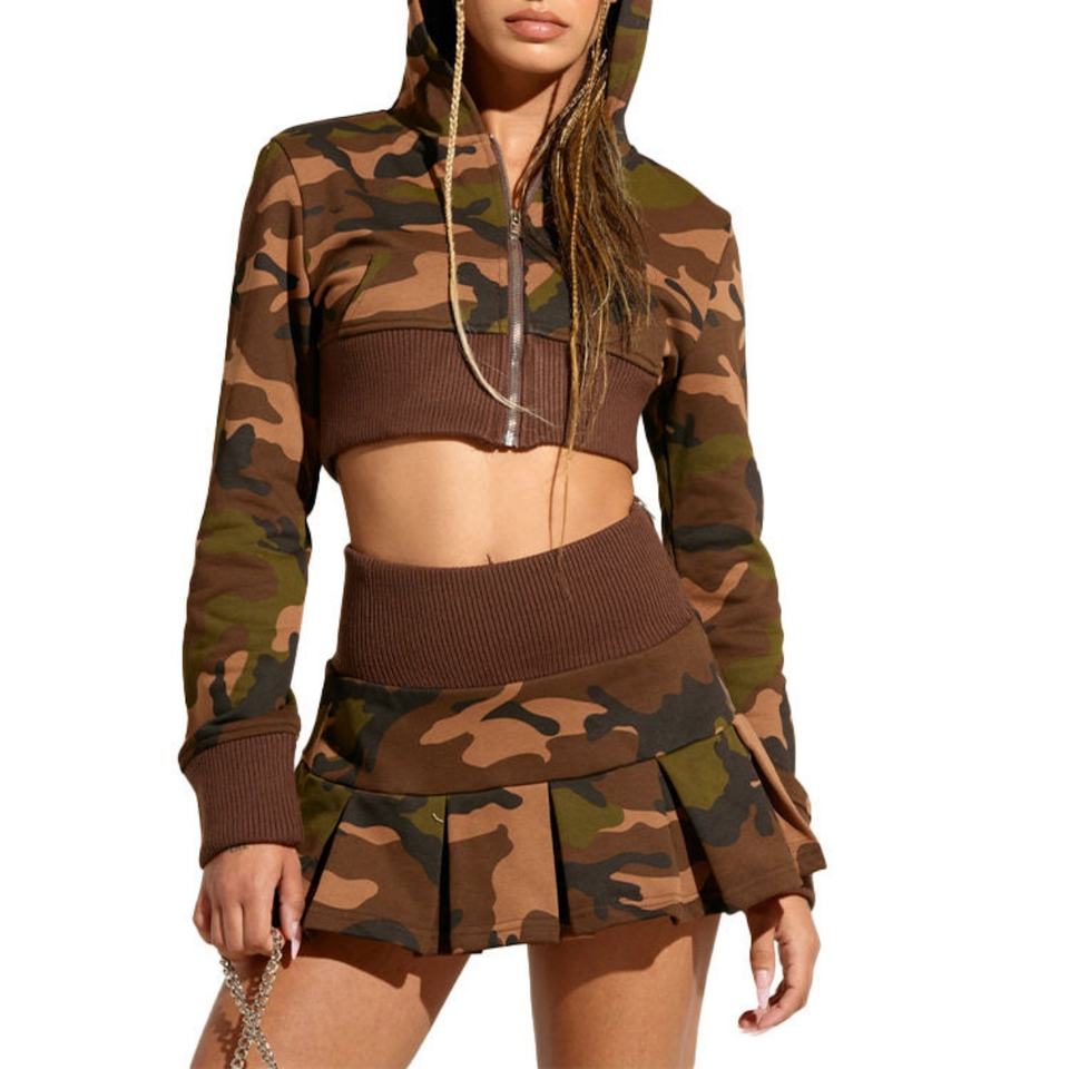 ชุดเซ็ตสตรีทแวร์ผู้หญิงลายพรางพิมพ์ดิจิทัลผ้าเทอร์รี่คอตตอนพร้อมฮู้ดครอปและกระโปรงมินิทรงเอวสูงจีบระบาย ชุดเซ็ตสองชิ้นสำหรับผู้หญิงพร้อมโลโก้แบบกำหนดเอง