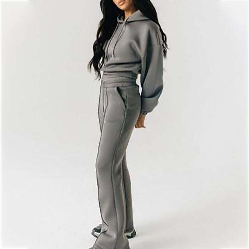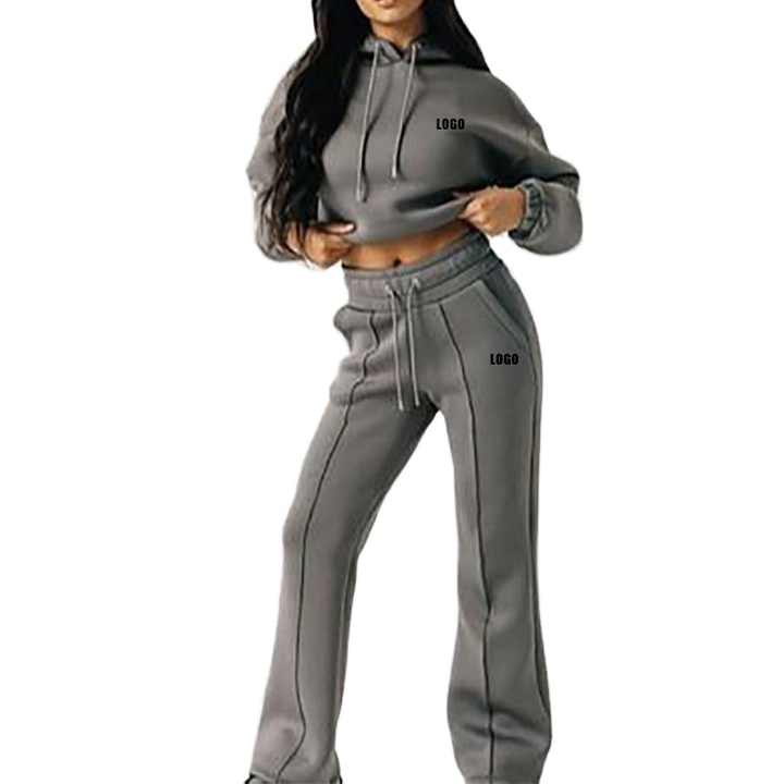 ชุดวอร์มผู้หญิงแบบมีโลโก้สั่งทำพิเศษ พร้อมเสื้อฮู้ดครอปและกางเกงขายาวทรงตรง ชุดเซ็ท 2 ชิ้น เสื้อฮู้ดทรงหลวม