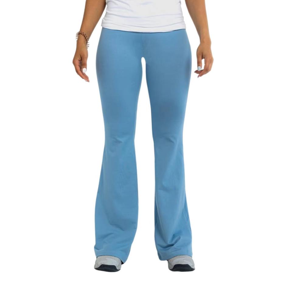 กางเกงโยคะขาบานทรงวีครอสสำหรับผู้หญิง พิมพ์โลโก้ได้ตามต้องการ ระบายอากาศได้ดี กางเกงออกกำลังกายขายาวทรงกระบอก OEM