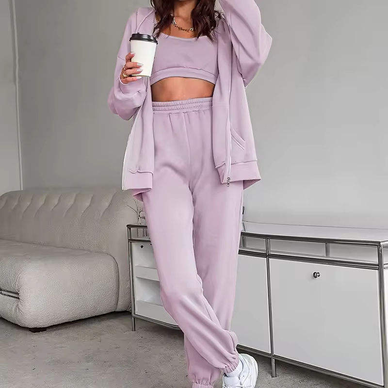 ชุดเซ็ต 3 ชิ้นสำหรับผู้หญิง ลายโลโก้แบบกำหนดเอง เสื้อฮู้ดแขนสั้นแบบสวม ผ้าทึบ เสื้อกล้าม และกางเกงขายาว