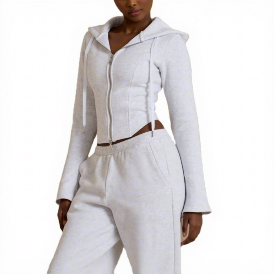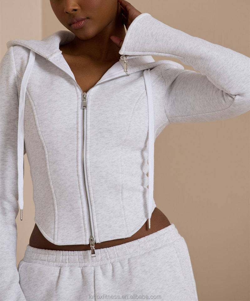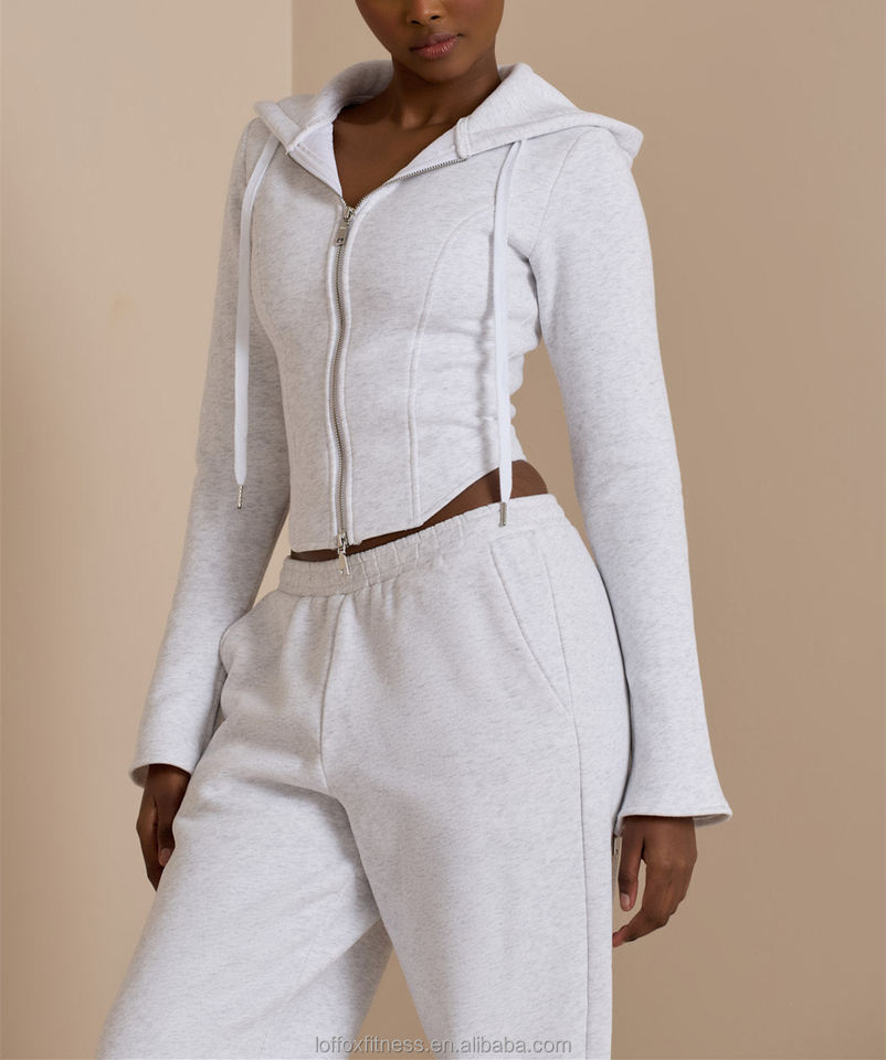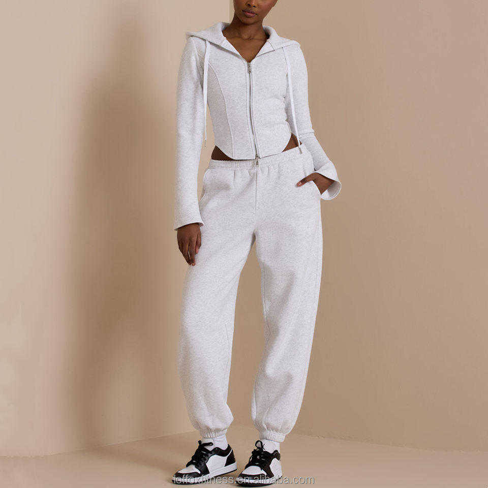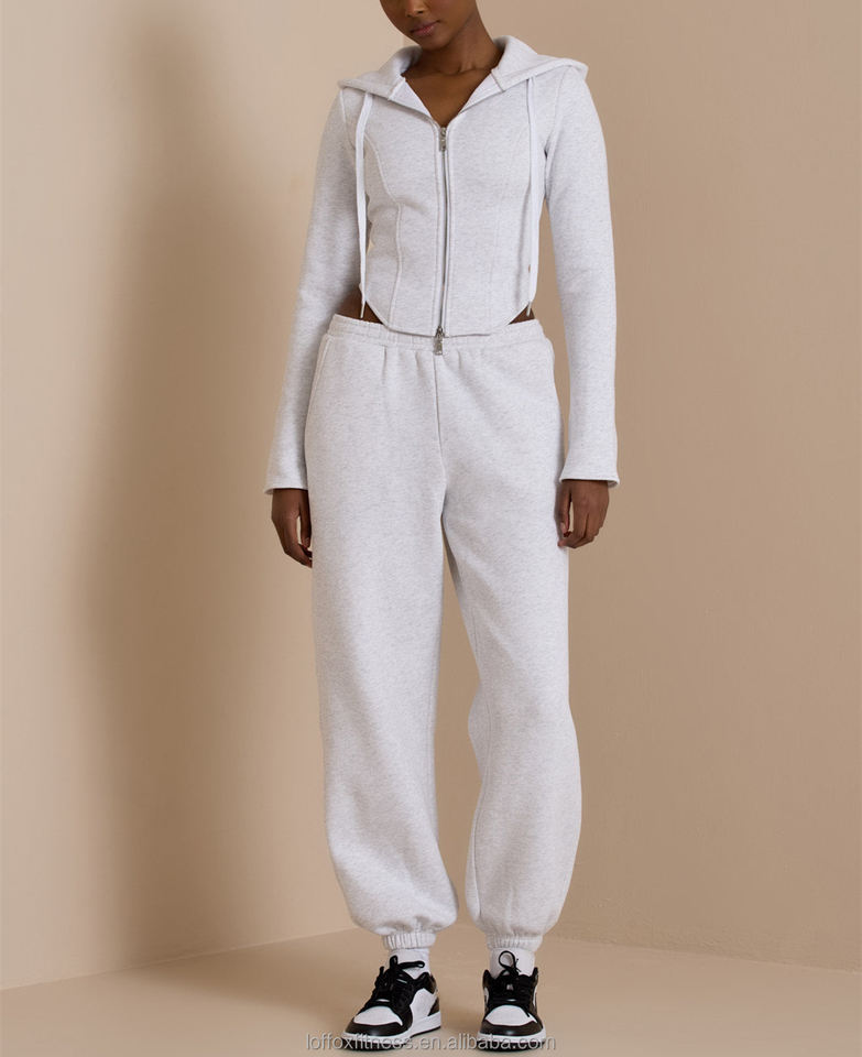 ชุดเซ็ตเสื้อแจ็คเก็ตมีซิปและกางเกงขาบานลำลองสำหรับผู้หญิง พิมพ์โลโก้ได้ตามต้องการ ผ้ากำมะหยี่มีฮู้ด ชุดวอร์ม 2 ชิ้น ผ้าฝ้าย 100%