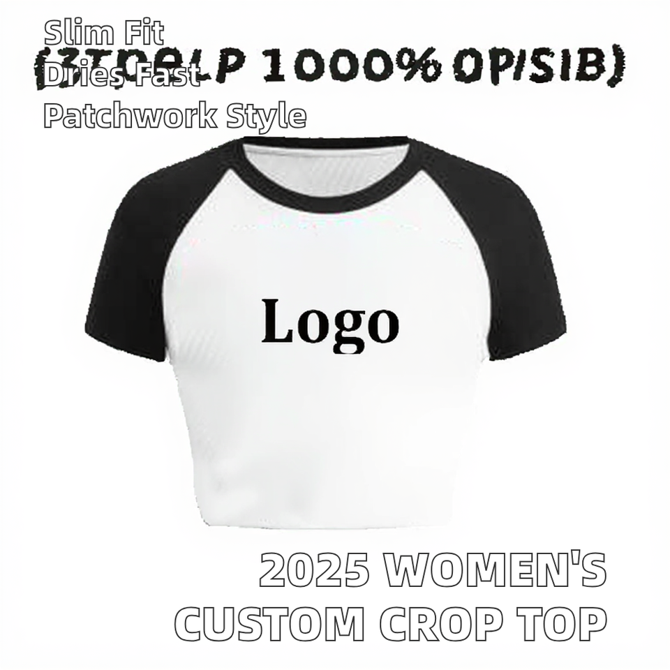 เสื้อครอปท็อปผู้หญิงทรงสลิมฟิตลำลอง พิมพ์ลายโลโก้ตามสั่ง สำหรับฤดูร้อนปี 2025 เสื้อยืดคอกลม ผลิตจากผ้าสแปนเด็กซ์/คอตตอน ระบายอากาศได้ดี แห้งเร็ว เป็นมิตรกับสิ่งแวดล้อม