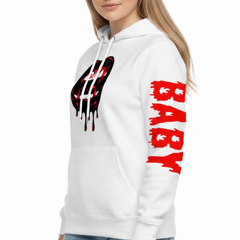 เสื้อฮู้ดผ้าฟลีซสีขาวสำหรับผู้หญิง พิมพ์ลายกราฟิกปากแวมไพร์ สไตล์สตรีทแวร์ ขายส่งจำนวนมาก รับทำโลโก้ตามสั่ง เสื้อฮู้ดหนานุ่มสำหรับฤดูหนาว