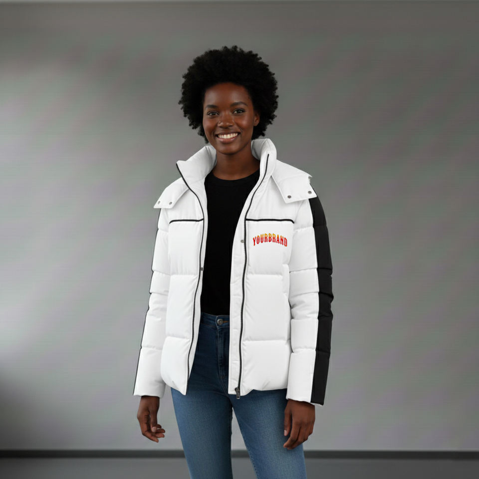 เสื้อแจ็คเก็ตพัฟเฟอร์ผู้หญิงแบบมีฮู้ด ปักโลโก้ตามสั่ง ทรงโอเวอร์ไซส์ ปิดซิป 2 สี กันน้ำ ซับในผ้าฝ้าย