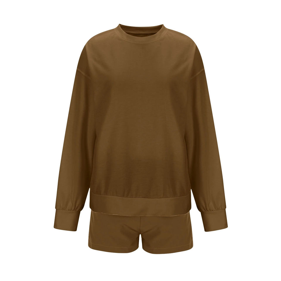 เสื้อสเวตเชิ้ตแขนยาวคอกลมสีพื้นสำหรับผู้หญิงพร้อมโลโก้แบบกำหนดเอง และกางเกงขาสั้นผ้าฟลีซทรงโอเวอร์ไซส์ ชุด 2 ชิ้น เป็นมิตรกับสิ่งแวดล้อม