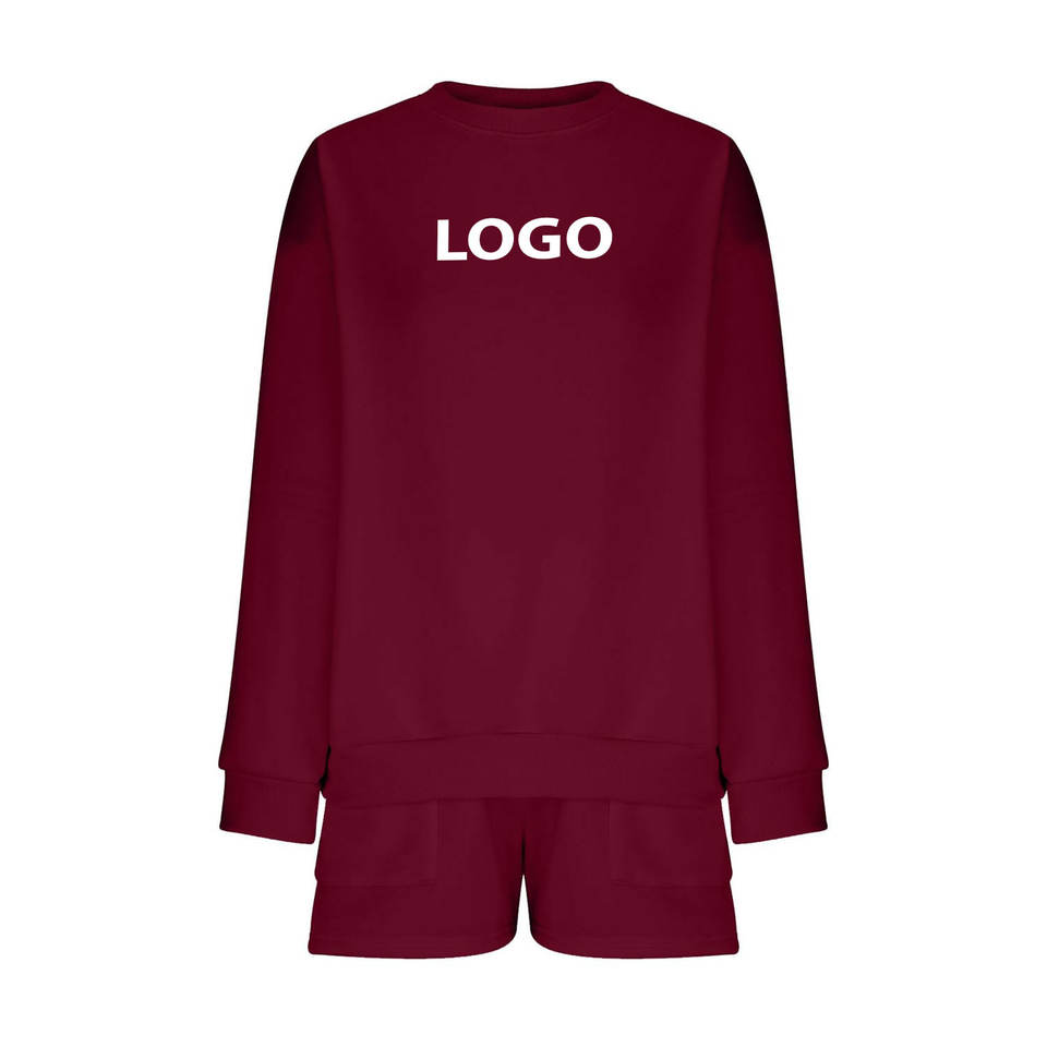 เซ็ตเสื้อสเวตเตอร์คอกลมทรงหลวมและกางเกงขาสั้นสำหรับผู้หญิง2ชิ้นลำลองสีทึบโลโก้ออกแบบได้ตามต้องการ