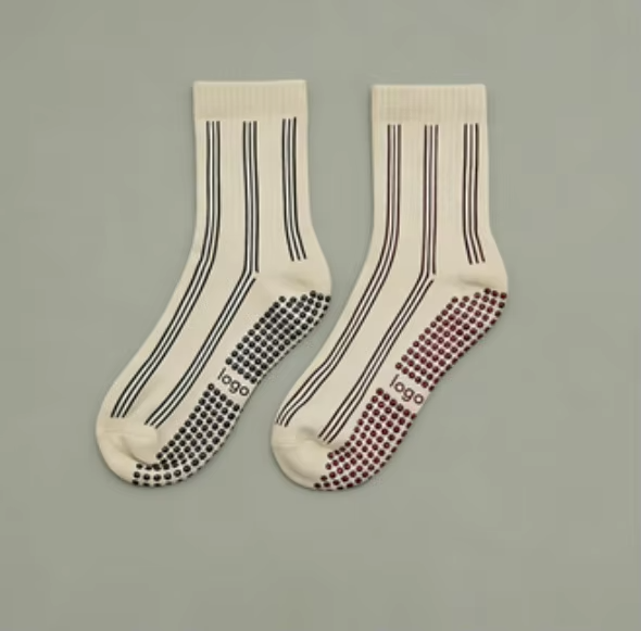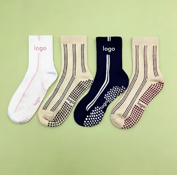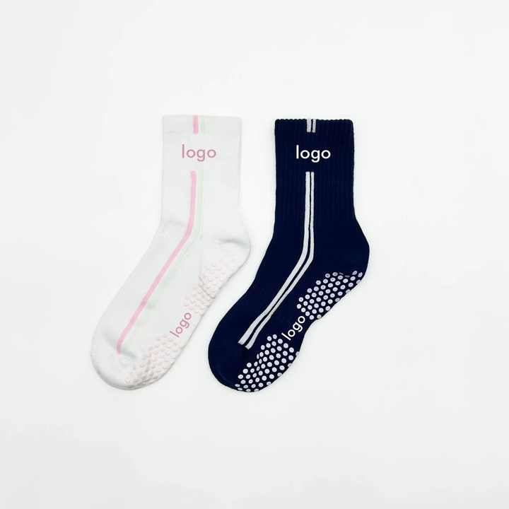ถุงเท้าพิลาทิสกันลื่นลายดอกไม้สำหรับผู้หญิงและเด็ก โลโก้สั่งทำได้ ผ้าฝ้าย 100% สำหรับเล่นโยคะ บาร์เร่ และออกกำลังกาย
