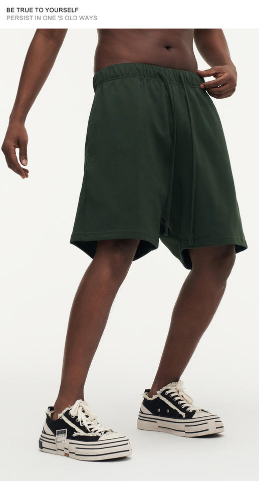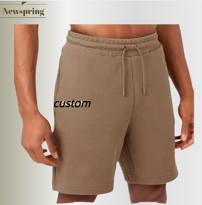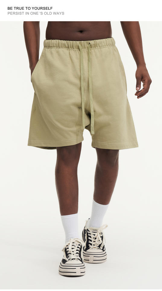 กางเกงขาสั้นผู้ชายผ้าวอร์สเตดแบบมีเชือกผูกเอว พิมพ์โลโก้ได้ตามต้องการ ระบายอากาศได้ดี เป็นมิตรกับสิ่งแวดล้อม แห้งเร็ว สไตล์ลำลอง ลุควินเทจ ซักแบบวินเทจ ล้างสีแบบแอซิด ทรงหลวม