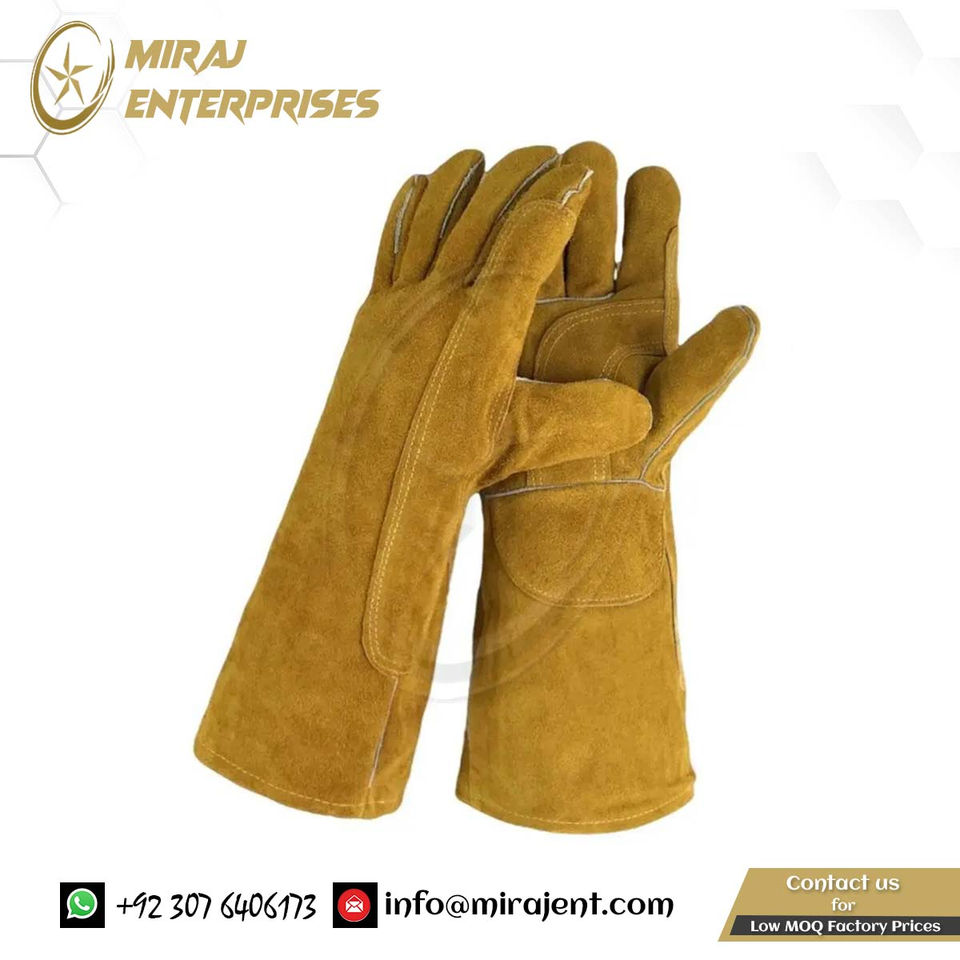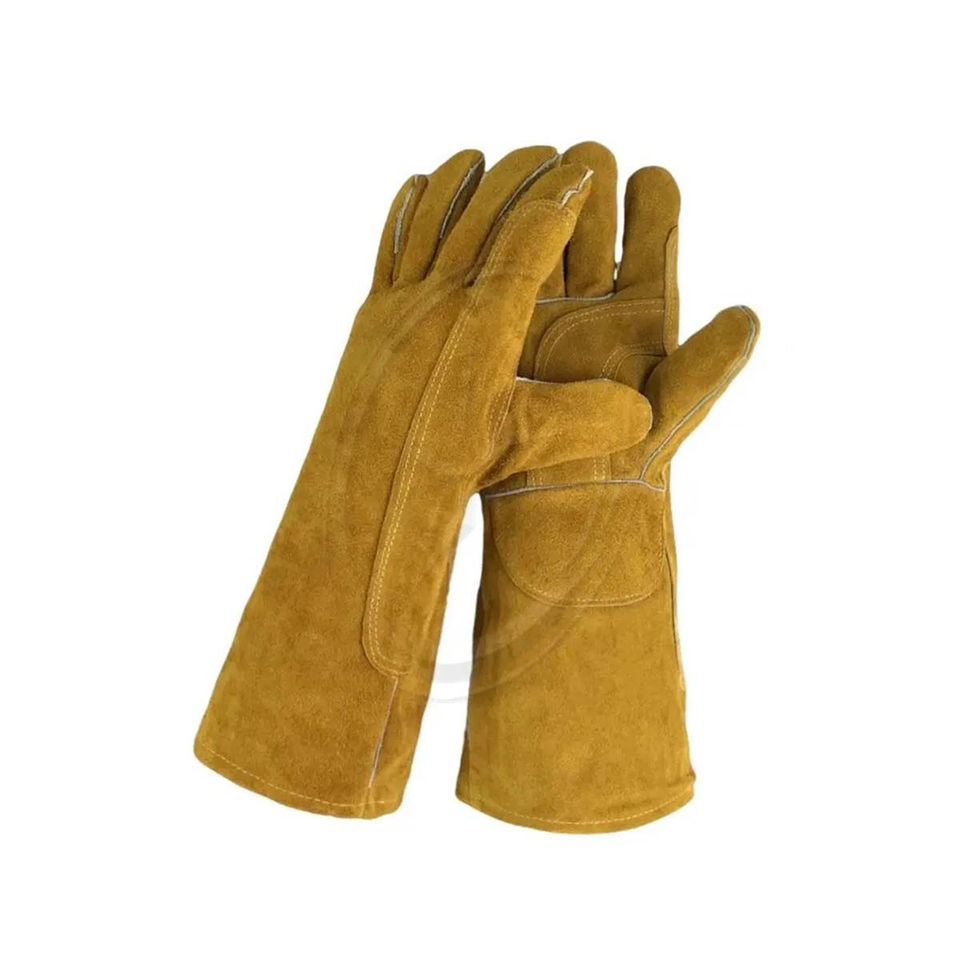 ถุงมือเชื่อมหนังวัวแบบยาวงานตามสั่งถุงมือป้องกันความร้อนทนทานต่อการฉีกขาด