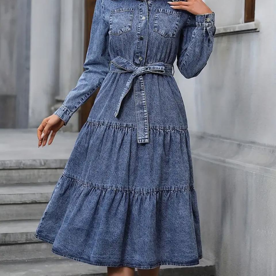 เดรสยีนส์ผู้หญิงทรงมิดิ แขนยาว แต่งระบาย ซ้อนชั้น ปกเสื้อแบบลาペル มีเข็มขัด ลุคซักฟอก