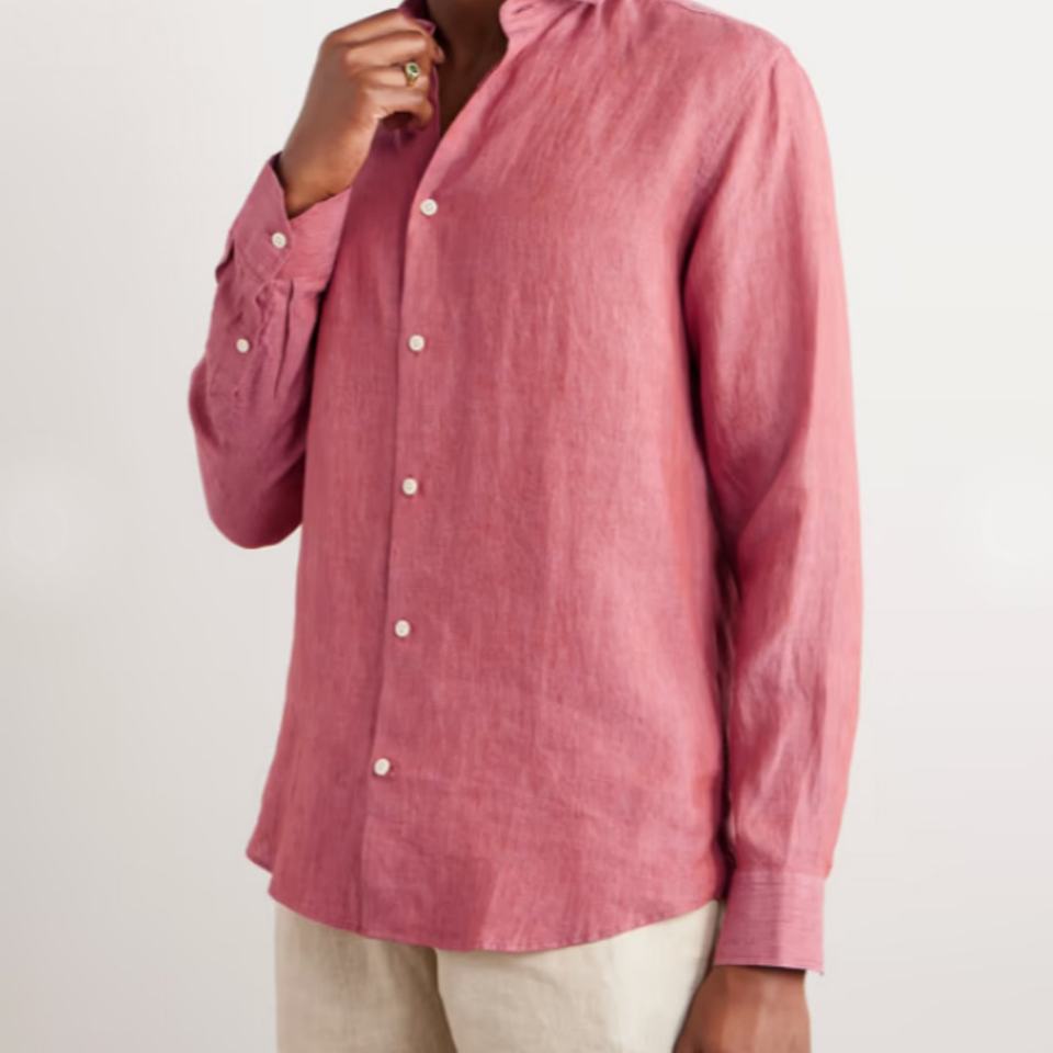 เสื้อเชิ้ตผู้ชายผ้าลินิน 100% ทรงปกติ แขนยาว คอปกแบบคัตอะเวย์ สีพื้น