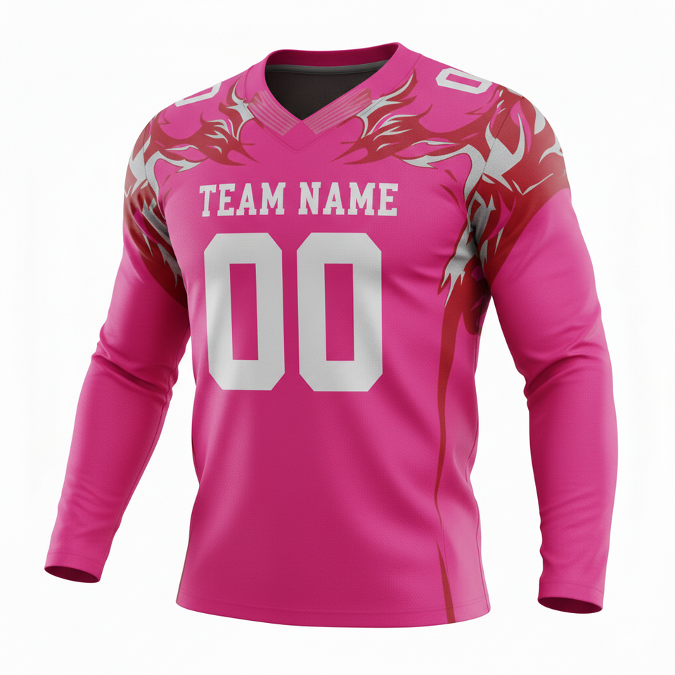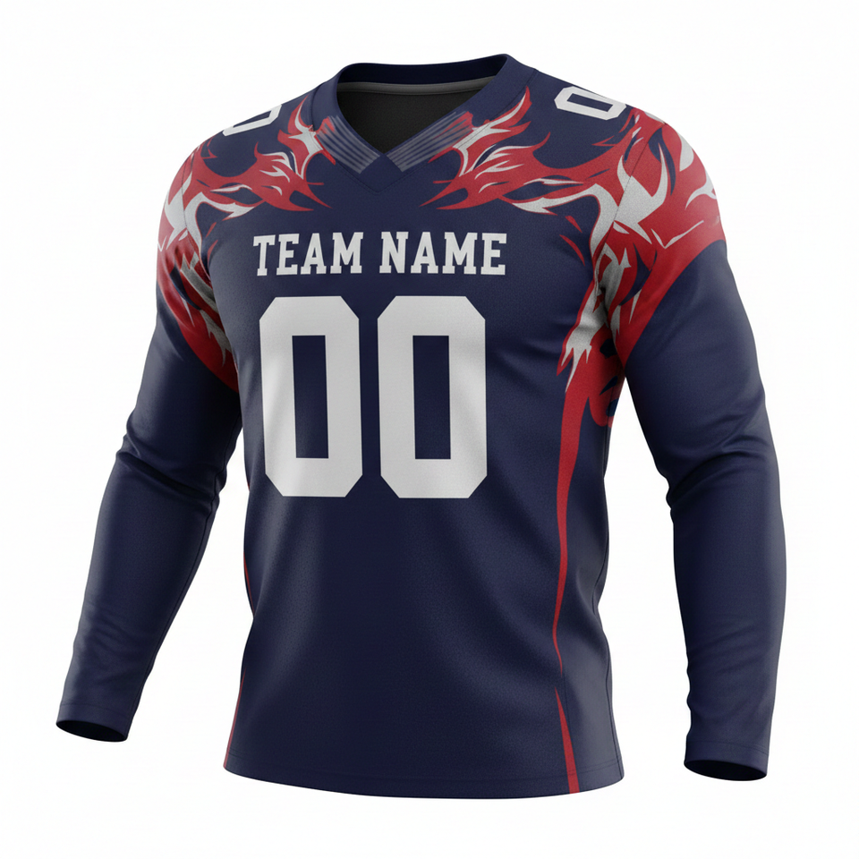 ชุดยูนิฟอร์มอเมริกันฟุตบอลแขนยาวแบบกำหนดเอง พร้อมกางเกงขาสั้น ตำแหน่งโลโก้ด้านหน้า ผลิตจากโพลีเอสเตอร์ 100% ป้องกันแบคทีเรีย แห้งเร็ว