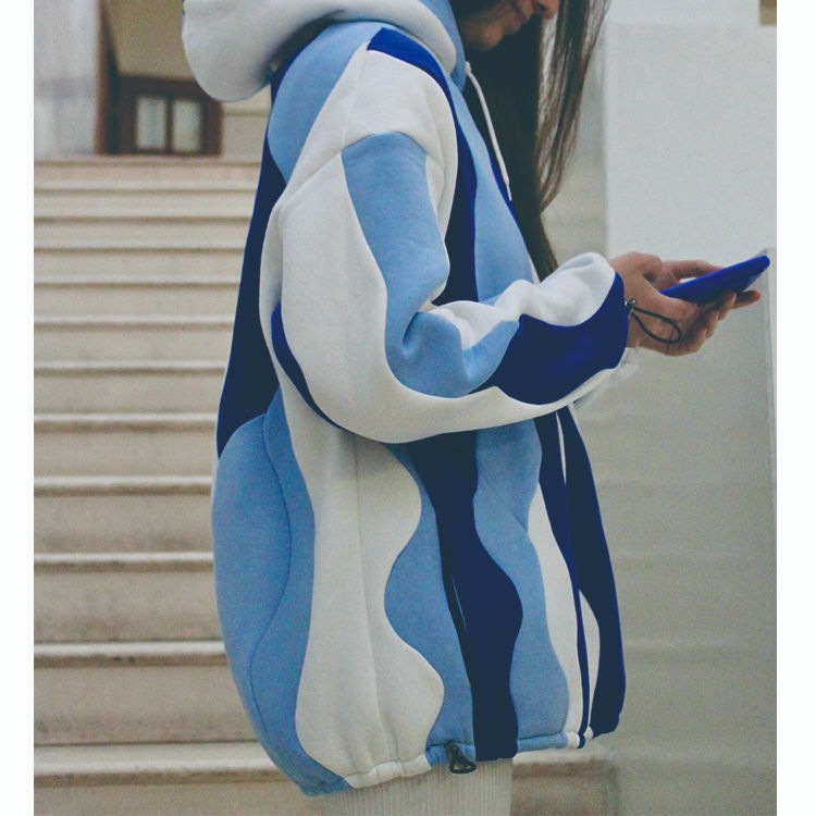 เสื้อฮู้ดดี้ผู้หญิงทรงหลวมแบบมีซิป ปักลาย แต่งผ้าสีผสมแบบแพทช์เวิร์ค ไหล่ตก ผ้าฟลีซ