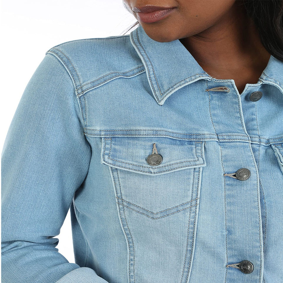 แจ็กเก็ตยีนส์ออร์แกนิกขนาดกลางสำหรับผู้หญิงแจ็กเก็ตยีนส์ทรักเก็ตผู้หญิงแบบคลาสสิกปกสองชั้นออกแบบได้ตามต้องการ