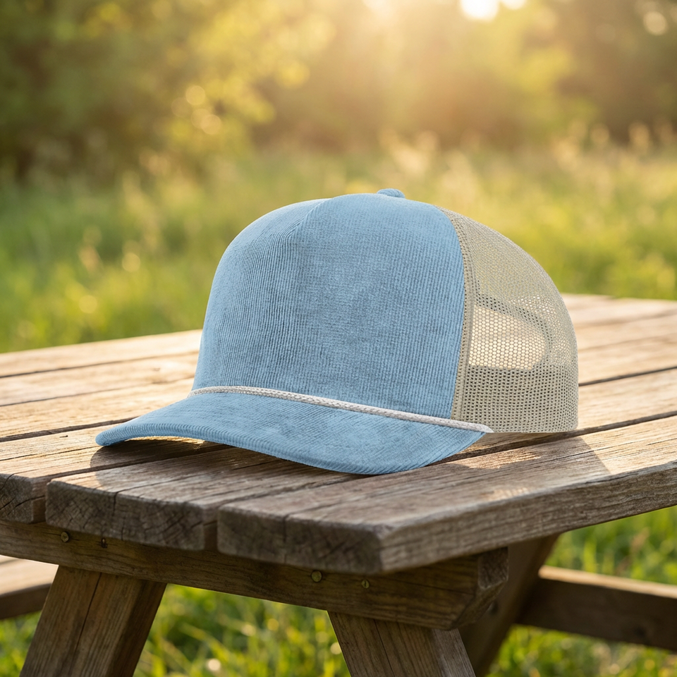 หมวกแก๊ปทรงทรัคเกอร์แบบตาข่ายด้านหลัง ปรับขนาดได้ ปีกโค้ง หมวก Snapback 5 ชิ้น ผ้าคอร์ดูรอย