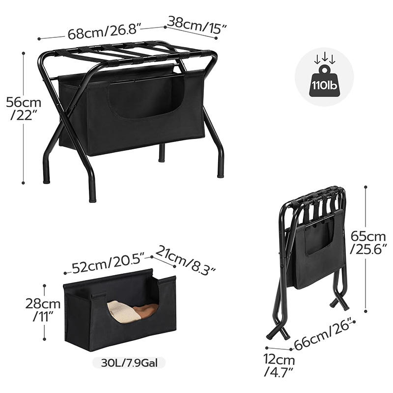 ชั้นวางกระเป๋าเดินทางแบบพับได้สองชั้น แบบตั้งพื้น ทำจากโลหะและโพลีเอสเตอร์ พร้อมถุงเก็บผ้าสำหรับห้องนั่งเล่น